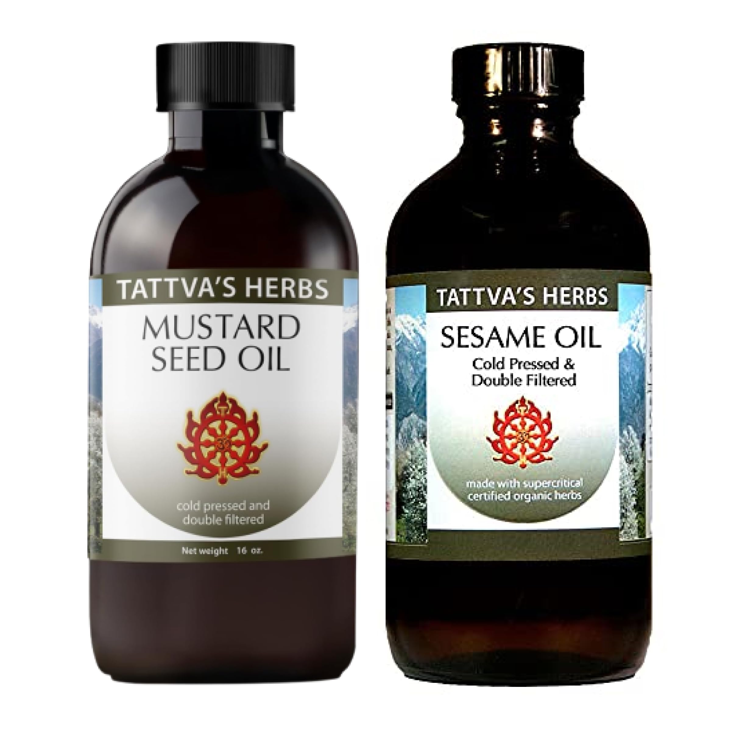 PROVIDING 25 YEARS OF PREMIUM SERVICE. FROM TATTVA'S HERBS. (1) Sesame Oil 16 oz. (1) Mustard Seed Oil 16 oz. BUNDLE INCLUDES : 2 Packs Of Our Premium Cold Pressed Oils.