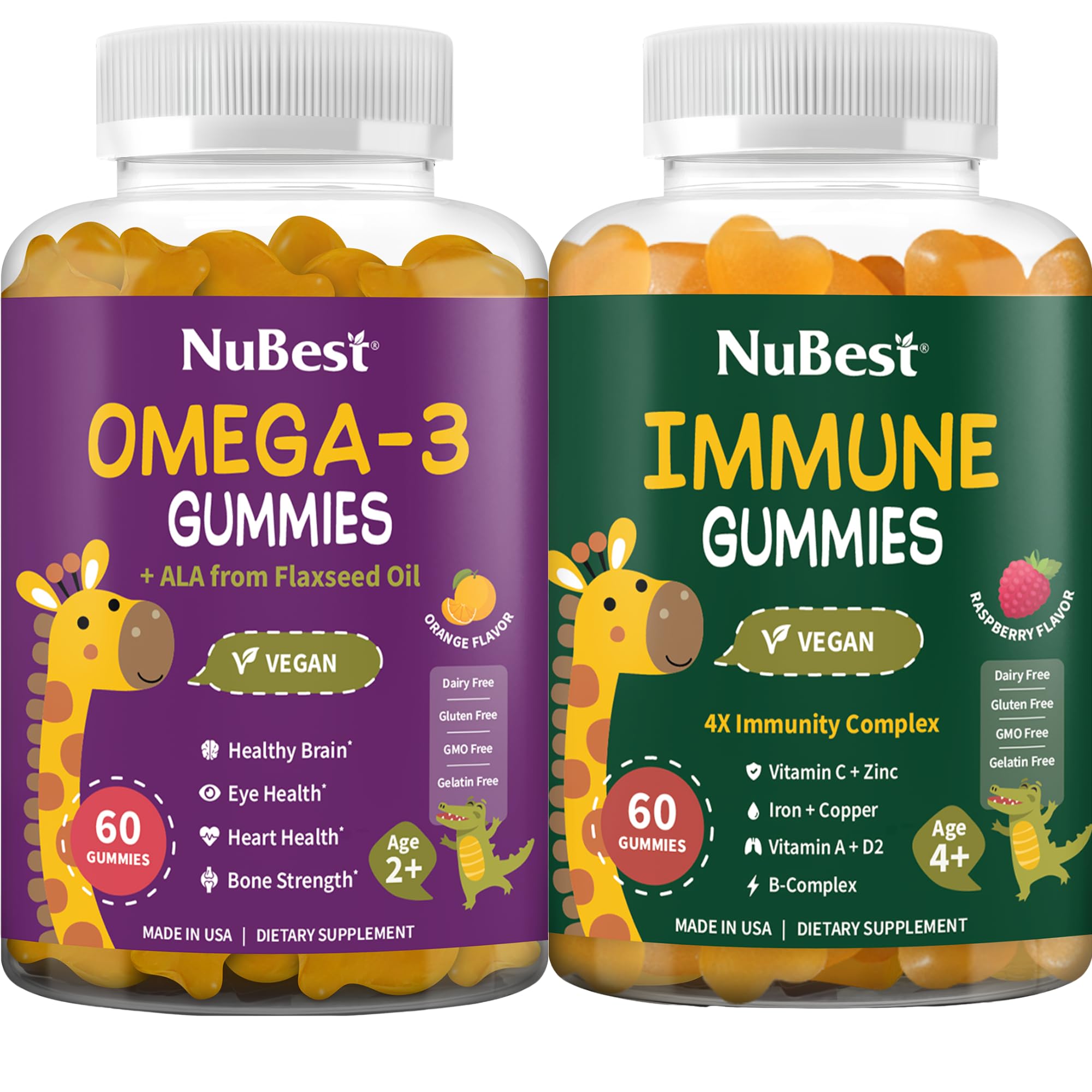 Support your child's daily wellness routine with this balanced NuBest Gummies Bundle, thoughtfully combining brain-focused nutrition and immune support in one easy, kid-friendly solution. NuBest Omega-3 Gummies are made with flaxseed oil to provide plant-based Omega-3 that complements brain, eye, and overall wellness as part of a healthy diet. Paired with NuBest Immune Gummies, which include essential vitamins and minerals, this bundle helps parents support immune health during school days, activities, and seasonal changes. With no added sugar, vegan-friendly formulas, and delicious orange and raspberry flavors, these easy-to-chew gummies fit naturally into everyday family routines. Designed for kids ages 4 (Immune Gummies) and suitable for children teens (Omega-3 Gummies), this bundle is ideal for active kids and picky eaters alike.Designed for Growing Kids: Suitable for children ages 4 (Immune Gummies) and kids teens (Omega-3 Gummies) great for school routines, active lifestyles, and picky eaters. Kid-Friendly, No Added Sugar: Delicious orange and raspberry flavors with easy-to-chew gummy textures, no added sugar, vegan-friendly, and parent-approved. Daily Immune Nutrition: Immune Gummies include vitamins C, D, A, B-complex, Zinc, and Iron to help support immune health in everyday life. Plant-Based Omega-3 Support: Omega-3 Gummies are made with flaxseed oil to complement brain, eye, and overall wellness, ideal for kids and teens who prefer a non-fish option. Brain Immune Wellness Bundle with Omega-3 Gummies and Immune Gummies to support brain function and immune wellness as part of a balanced daily routine.