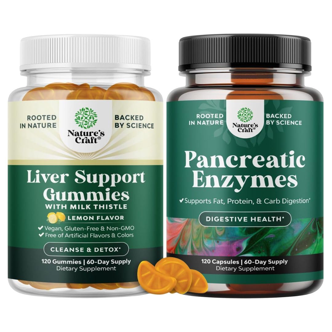 Natures Craft quality - We're proud to be a leading name in health supplements and we are committed to providing consumers like you with pure and responsibly-produced products you can trust. Simple but Effective Digestion Supplement - Pancreatic enzyme supplements work by supplementing the body's natural enzyme supply to ensure nutrient absorption and digestion to help prevent blockages. Pancreatin 4X - This proven combination of pure digestive enzymes for pancreas support and digestive health helps break down the main building blocks of food to keep your body functioning at its best. Milk Thistle Complex - Our liver support gummies for men and women are powered by milk thistle and other protective antioxidants to help maintain normal liver function and promote immunity. Tasty Liver Cleanser - Promote stronger functioning and cleansing with our unique delicious and nutritious liver gummies enriched with artichoke and turmeric extracts for liver care you can trust.