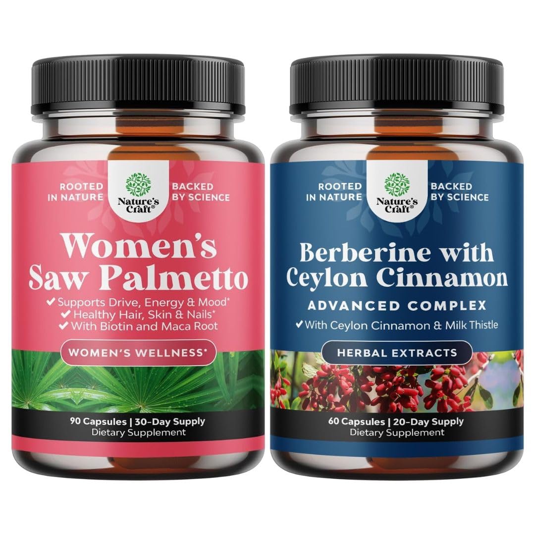 Bundle of Extra Strength Saw Palmetto for Women and Balancing Berberine Plus 1200mg Complex - DHT Blocker Thickening Hair Vitamins for Hair Loss - Antioxidant Berberine with Ceylon Cinnamon Capsules
