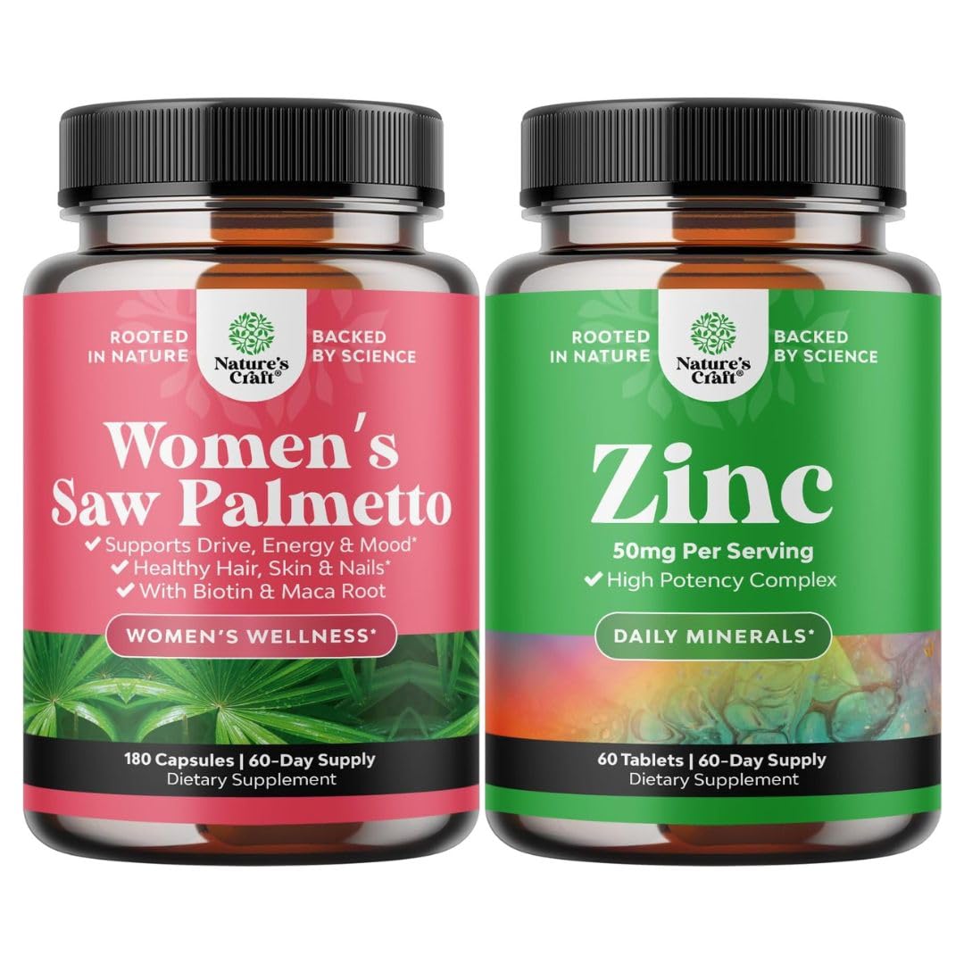 Bundle of Extra Strength Saw Palmetto for Women with Maca Root & Biotin for Stronger Healthier Looking Hair and Zinc 50mg Immune Support Supplement - Enhance Hair Skin and Nails Vitamins for Adults
