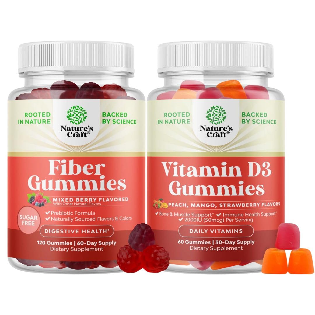Natures Craft quality - We're proud to be a leading name in health supplements and we are committed to providing consumers like you with pure and responsibly-produced products you can trust. Immune Support Gummies - Vitamin D is one of the most essential immunity vitamins for protecting your body but many adults don't get enough but our vitamin D gummies for women men got you covered. Potent Vitamin D Gummy - Vitamin D supplements are essential for maintaining proper health and our delicious gummies with D3 Vitamin 2000 IU makes it easier than ever to stay on top of your wellness. PROMOTES DIGESTIVE IMMUNE HEALTH – These soluble high fiber supplements help improve digestion, reduce bloating, regulate bowel movements, and support a healthy gut microbiome. This digestion supplement is essential for strong immune system and nutrient absorption. DELICIOUS SUGAR-FREE FIBER GUMMIES – Support your gut health and digestion with these fiber-rich, sugar-free fiber gummies for women men, made from chicory root inulin, a natural prebiotic that helps promote regularity and overall digestive wellness.