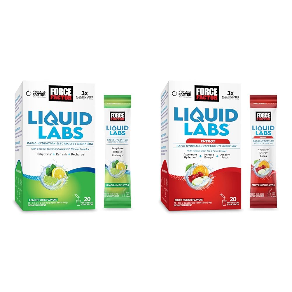 Bundle of FORCE FACTOR Liquid Labs Electrolytes Powder Hydration Packets to Make Electrolyte Water with 5 Vitamins Minerals and Antioxidants Lemon-Lime + Energy Fruit Punch Flavor 40 Stick Packs