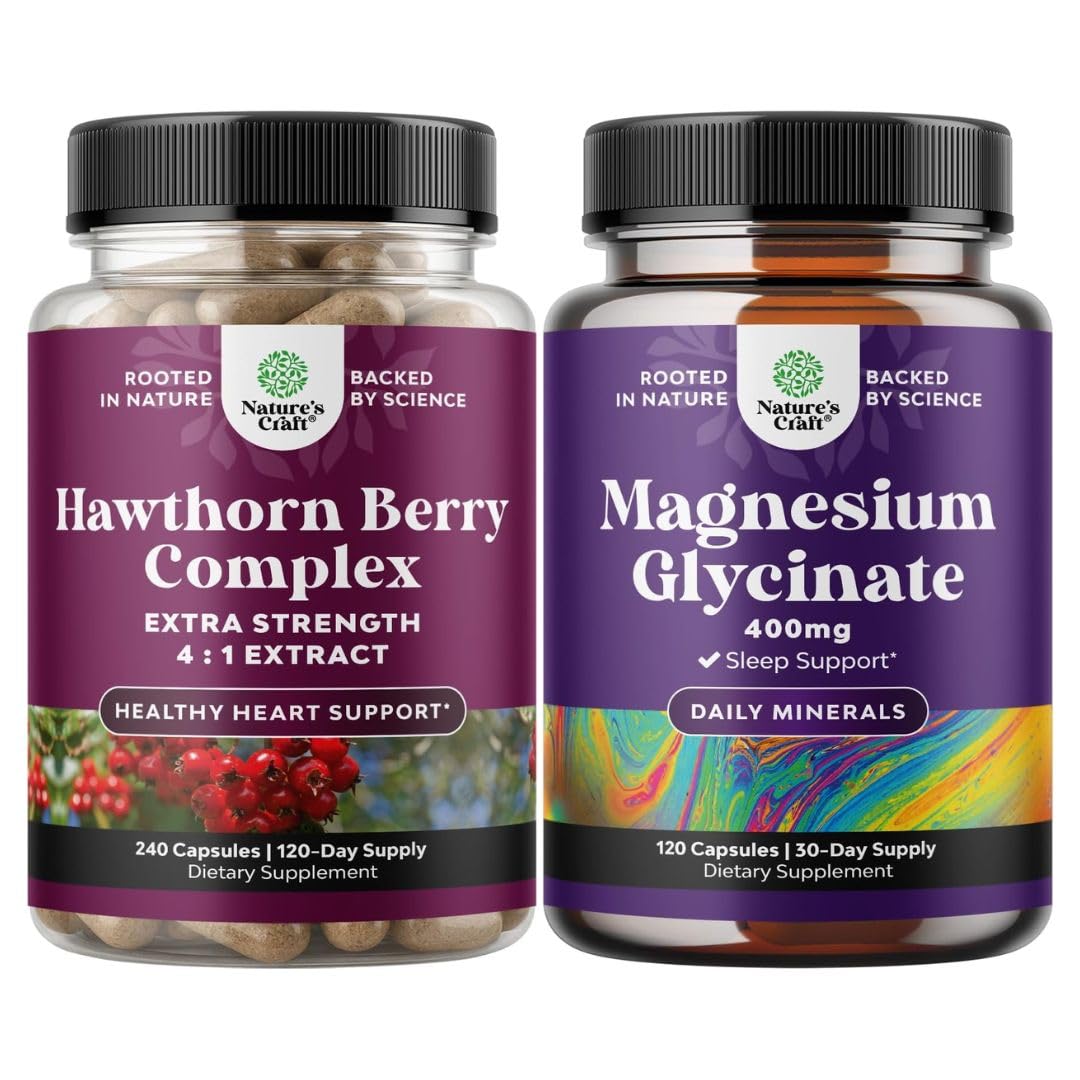 Bundle of High Strength Hawthorn Berry Capsules with Leaf & Flower Extract 4:1 for Healthy Heart & Digestion and Pure Magnesium Glycinate 400mg Per Serving - Vegan High Absorption Chelated Magnesium