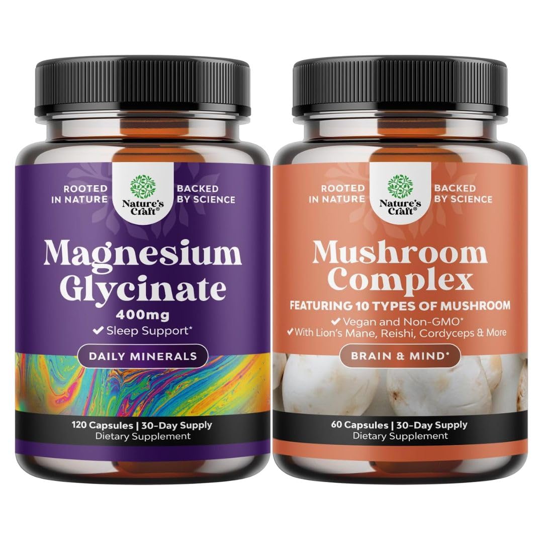 Natures Craft quality - We're proud to be a leading name in health supplements and we are committed to providing consumers like you with pure and responsibly-produced products you can trust. Cognitive Enhancer - Our mushroom pills are a great choice for herbal brain supplements for memory and focus support thanks to unique nootropic compounds found exclusively in these superstar mushrooms. 10X Blend - We use 10 types of adaptogenic mushrooms in our advanced functional mushroom nootropic supplement including Maitake Shiitake Turkey tail Royal sun and more to give you a complete product. Magnesium Mineral Supplements - Enhance your wellness with magnesium 400 mg for one of the most versatile minerals which may help improve the body's natural process and support immunity. Extra Strength Magnesium for Sleep - Try our chelated magnesium for sleep so you can rest better and wake up more refreshed thanks to the relaxing properties of this essential mineral.