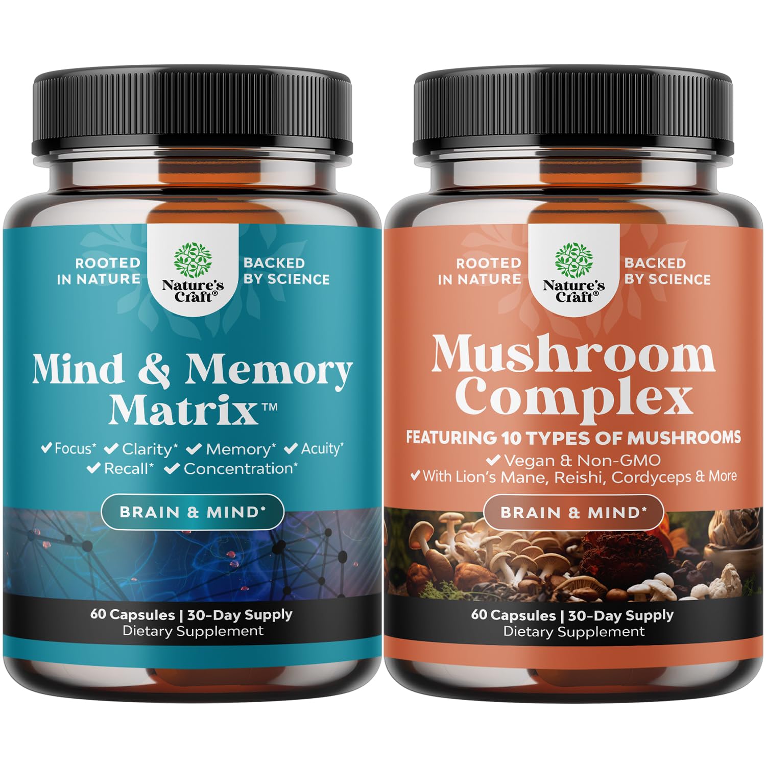 Bundle of Matrix Nootropic Brain Supplement for Memory and Focus Enhancement - Vitamins for Mental Health & Clarity and Advanced Mushroom Complex Capsules for Brain Health Memory Support & Focus