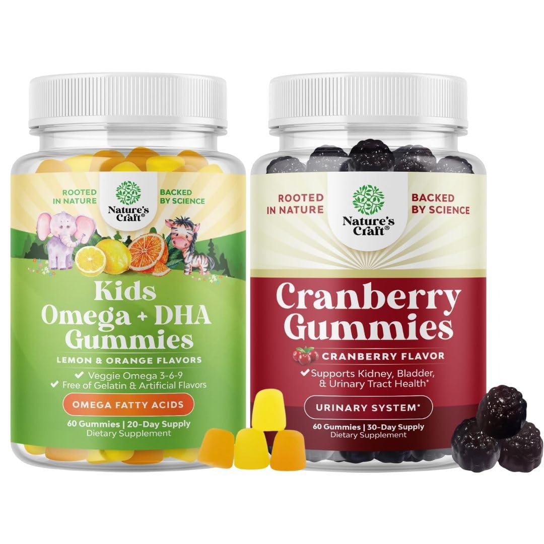 Natures Craft quality - We're proud to be a leading name in health supplements and we are committed to providing consumers like you with pure and responsibly-produced products you can trust. BOOST YOUR BLADDER HEALTH - Cranberry concentrate has been known to help improve bladder health as well as enhance urinary tract health and provides much needed kidney support for men and women. TAKE URINARY HEALTH SERIOUSLY - Experience the power of a more natural dietary supplement like our cranberry gummies that have been expertly formulated to give you essential kidney and bladder support. IMMUNE STRENGTH NERVOUS SYSTEM HEALTH – Our kids immune support helps your kid to fortify immune system and promote healthy nervous system development with our DHA-rich formula. These plant-based omega 3 for kids gummies provide vital nutrients to keep your child feeling their best. BRAIN VISION SUPPORT FOR KIDS – Our kids DHA omega 3 fatty acid supplements are packed with essential fatty acids, including Omega 3, 6, and 9, to support brain function, focus healthy vision. Designed for growing minds, these tasty gummies help your kid thrive.