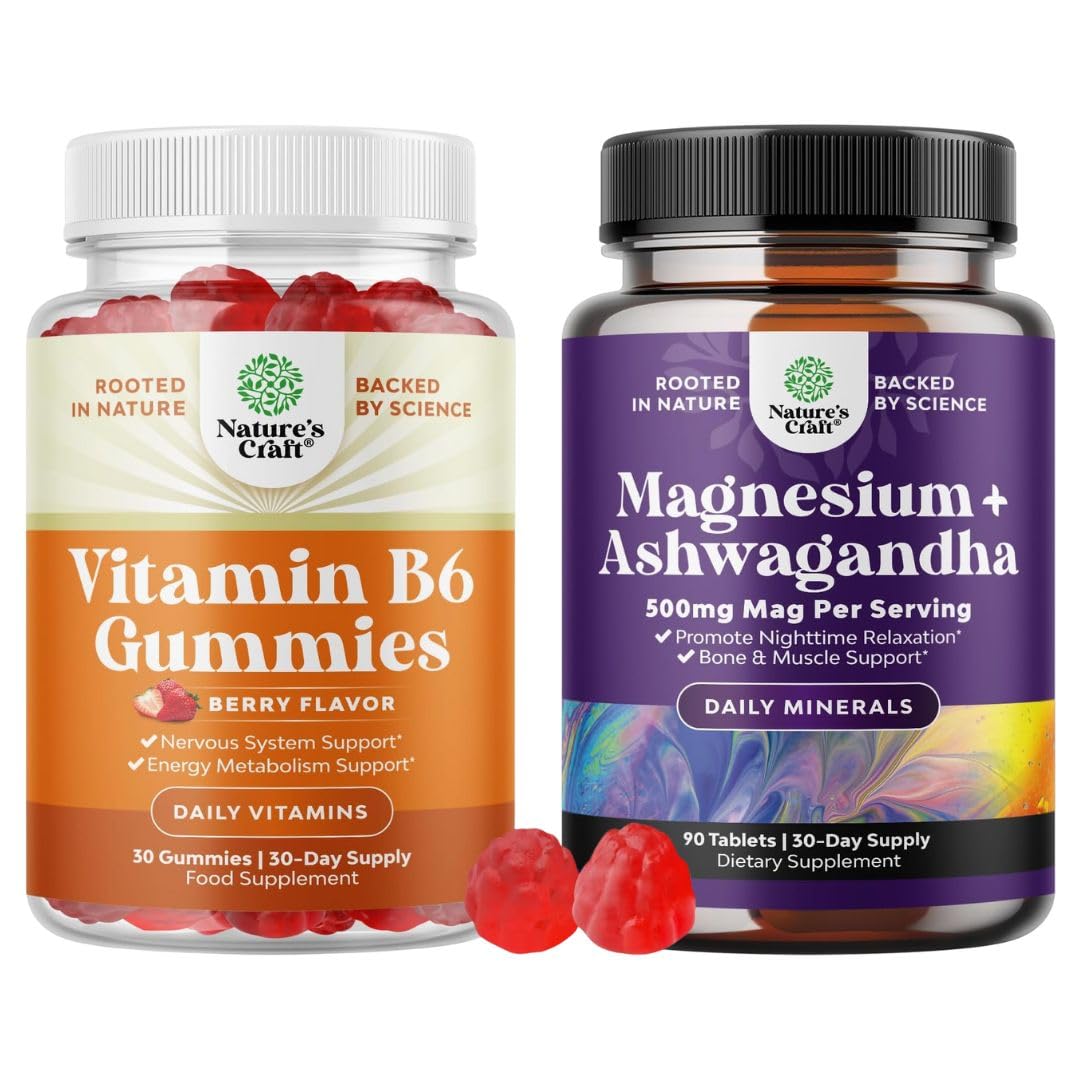 Bundle of Potent Vitamin B6 Gummies for Adults - Vitamin B Complex Supplements for Nervous System and Pure Calm Relaxing Magnesium Glycinate Supplement with Ashwagandha for Stress Support & Rest