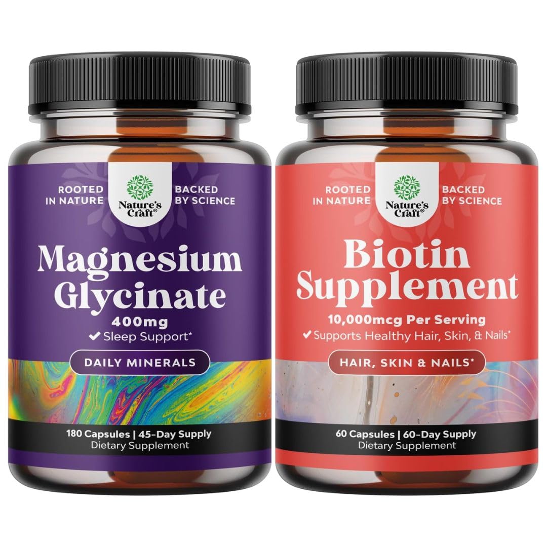 Natures Craft quality - We're proud to be a leading name in health supplements and we are committed to providing consumers like you with pure and responsibly-produced products you can trust. Pure Biotin Supplement - Our biotin pills are loaded with anti aging vitamins to keep your skin glowing and acts as a natural hair growth nutrient to boost hair volume nail growth and healthy skin. Hair Growth Supplement - Thicker hair Biotin 10000mcg maximum strength B vitamin veggie capsules fight dry hair breakage and promote healthy skin long hair and fast nail growth. Magnesium Mineral Supplements - Enhance your wellness with magnesium 400 mg for one of the most versatile minerals which may help improve the body's natural process and support immunity. Extra Strength Magnesium for Sleep - Try our chelated magnesium for sleep so you can rest better and wake up more refreshed thanks to the relaxing properties of this essential mineral.