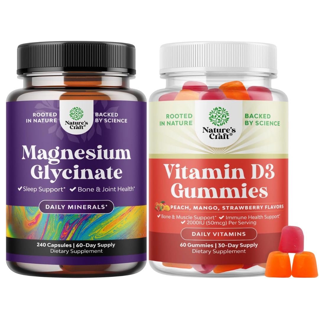 Bundle of Pure Magnesium Glycinate Supplement 400mg Per Serving for Mood Sleep & Relaxation Support and Vitamin D3 Gummies for Daily Wellness with 2000IU per Serving Bone Muscle & Immune Support
