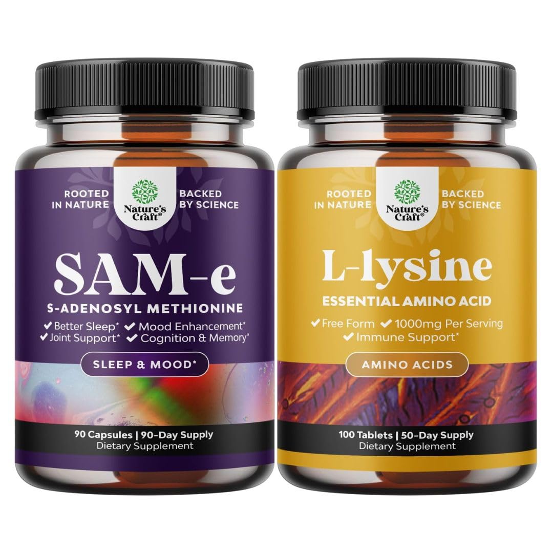 Bundle of Pure SAM E Supplement 150mg - Nootropic Same 150mg Per Serving for Memory & Brain Support and L Lysine 1000mg Free Form - L-Lysine Supplement for Eye Health Lip Care Collagen Synthesis