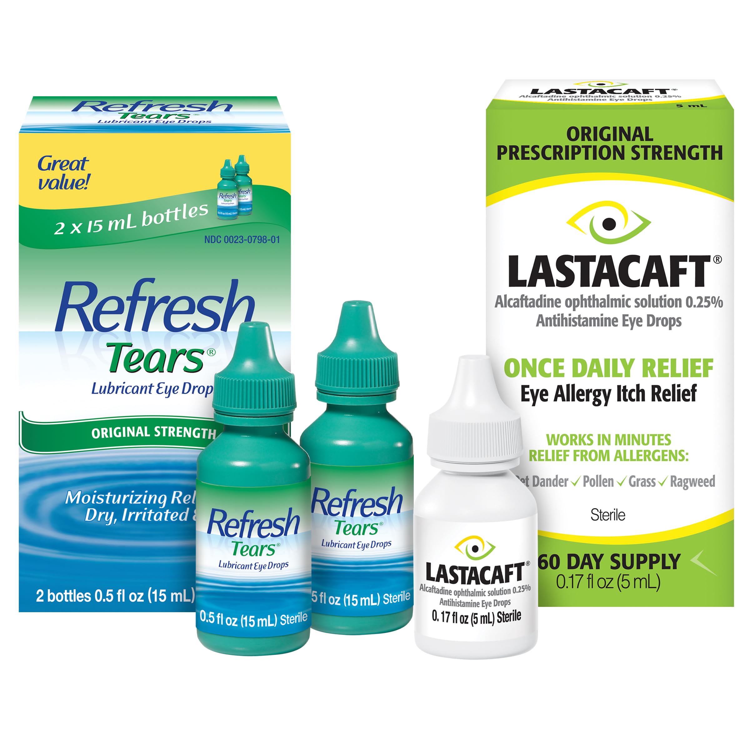 Lastacaft: RELIEF FROM ALLERGENS: Works in minutes against seasonal and year-round allergens: pollen, grass, ragweed, animal hair, and pet dander. Lastacaft: Rx-STRENGTH: Patented, prescription-strength formula available without the prescription. Lastacaft: GREAT VALUE: Each bottle of LASTACAFT contains a 60-day supply and is FSA HSA eligible. Lastacaft: LONG-LASTING: A once daily drop that lasts up to 24 hours (based on 16-24 hour studies). Lastacaft: FAST-ACTING: Relieves itchy eyes from allergies in as little as 3 minutes. Refresh Tears: Doctor recommended with over 30 years of experience REFRESH Family of Products, Ipsos Healthcare, 2021 REFRESH ECP Recommendation Survey. Refresh Tears: Designed to act like your own natural tears. Refresh Tears: Instantly moisturizes and lubricates. Refresh Tears: Relieves mild symptoms of eye dryness. Refresh Tears: Original strength formula.