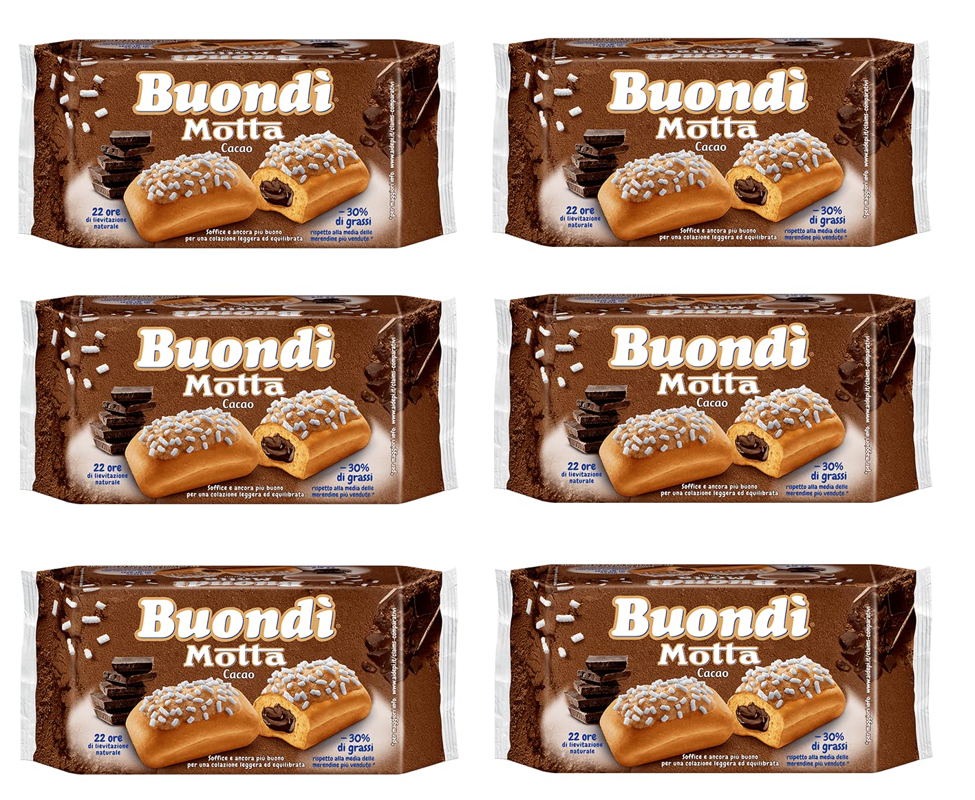 Buondì Cacao gives you more flavor when you wake up, with 30 less fat . A soft cake (purified for 22 hours) filled with a delicious cocoa cream and a touch of melt-in-your-mouth icing. If we haven't convinced you yet, its veins will. Ingredients: Naturally baked sweetened product, filled (21 ) with cocoa cream. Wheat flour, sugar, natural yeast (wheat), vegetable oils and fats (palm, sunflower), glucose syrup, egg yolk, sugar granules (3 ), chocolate (2 ) [sugar, low-fat cocoa powder (0.7 ), cocoa butter, cocoa mass, emulsifiers: mono- and diglycerides of fatty acids, extra sugar, palm fat, skimmed milk, flavorings, emulsifiers: mono- and diglycerides of fatty acids, sunflower oil, salt, white powder, hazelnut paste, thickener: pectin]. May contain other nuts and soy. Nutritional values per 100g: Energy 1563 kJ – 372 kcal - Fat 12.0g of which: saturates 5.7g - Carbohydrate 58g of which sugars 28g - Fiber 1.6g - Protein 7.2g - Salt 0.48g INGREDIENTS Naturally baked confectionery product filled (21 ) with cocoa cream. Wheat flour, sugar, natural yeast (wheat), vegetable oils and fats (palm, sunflower), glucose syrup, egg yolk, sugar granules (3 ), chocolate (2 ) [sugar, low-cocoa powder (0.7 ), cocoa butter, cocoa mass, emulsifiers: mono- and diglycerides of food]. Sea fatty acids, Extraose, palm fat, skimmed milk, flavourings, emulsifiers: mono- and diglycerides of fatty acids, sunflower oil, salt, white powder, hazelnut paste, thickener, pectin. May contain other nuts and soy.Motta Buondì Cacao Lot de 6 bonbons avec crème de cacao 258 g (6 x 43 g)DESCRIPTION DU PRODUIT DESCRIPTION DU PRODUIT Buondì Cacao vous donne plus de goût au réveil, avec 30 de graisse en moins . Une pâte molle (22 heures purifiées) remplie d'une délicieuse crème de cacao avec une touche de glaçage délicieuse qui se fond dans la bouche. Si nous ne vous avons pas convaincu, vous serez convaincu par ses veinures. Ingrédients : produit sucré naturellement cuit, rempli (21 ) de crème de cacao. farine de blé, sucre, levure naturelle (blé), huiles et graisses végétales (palme, tournesol), sirop de glucose, jaune d'œuf, grains de sucre (3 ), chocolat (2 ) [sucre, poudre faible en cacao (0,7 ), beurre de cacao, masse de cacao, émulsifiants : mono et diglycérides des alimentaires. acides gras de mer, dExtraose, graisse de palme, lait écrémé, arômes, émulsifiants : mono et diglycérides d'acides gras alimentaires, huile de tournesol, sel, poudre blanche, pâte de noisette, épaississant, pectine. Peut contenir d'autres noix et soja. Valeurs nutritionnelles pour 100 g : énergie 1563 kJ – 372 kcal - graisses 12,0 g dont : acides gras saturés 5,7 g - HYDRATE de carbone 58 g dont sucre 28 g - Fibres 1,6 g - Protéine 7,2 g - Sel 0,48 g INGRÉDIENTS Produit de confiserie naturellement cuit, rempli (21 ) de crème de cacao. farine de blé, sucre, levure naturelle (blé), huiles et graisses végétales (palme, tournesol), sirop de glucose, jaune d'œuf, grains de sucre (3 ), chocolat (2 ) [sucre, poudre faible en cacao (0,7 ), beurre de cacao, masse de cacao, émulsifiants : mono et diglycérides des alimentaires. acides gras de mer, dExtraose, graisse de palme, lait écrémé, arômes, émulsifiants : mono et diglycérides d'acides gras alimentaires, huile de tournesol, sel, poudre blanche, pâte de noisette, épaississant, pectine. Peut contenir d'autres noix et soja.