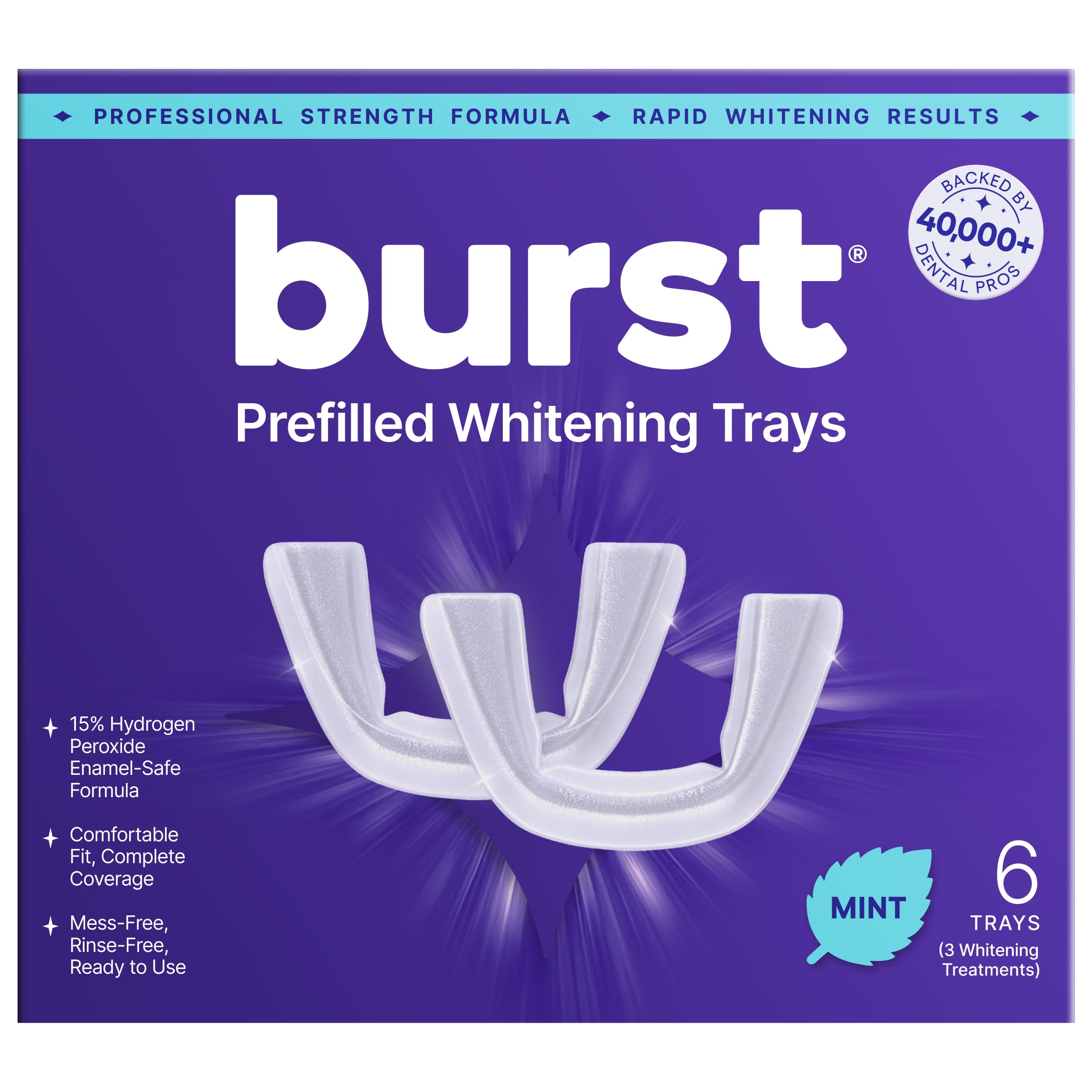 , - : Pop in your prefilled teeth trays and let the 15 hydrogen peroxide formula do the work. In 30 minutes a day for 3 days, you'll see visibly whiter teeth — no tools, no hassle, no mess. , - : Formulated with enamel-safe, vegan ingredients and zero harsh additives, burst teeth whitening trays with gel deliver guilt-free brilliance so you can feel good about using the cleanest trays for teeth whitening, trusted by dental professionals. : Our most advanced whitening formula combines 15 hydrogen peroxide with soothing aloe vera, coconut oil, and xylitol for maximum brightness and minimal sensitivity so you can whiten confidently without the sting. Designed for use with prefilled teeth whitening trays and professional-grade dental trays for whitening teeth, it delivers comfort and performance in every session. : Our innovative comfort-fit design adapts to every curve of your smile for deep, consistent whitening coverage, no slipping, no uneven spots, just full 360 results from top to bottom. Each flexible whitening tray is crafted to perform like professional teeth whitening gel trays, ensuring an even, secure fit every time. : Meet the burst prefilled teeth whitening trays, designed with dental pros to bring powerful, professional-grade whitening home. Each flexible U-shaped whitening tray comes prefilled with our 15 hydrogen peroxide gel for quick, even, and mess-free results that fit easily into your daily routine, the ultimate teeth trays for whitening trusted by professionals.