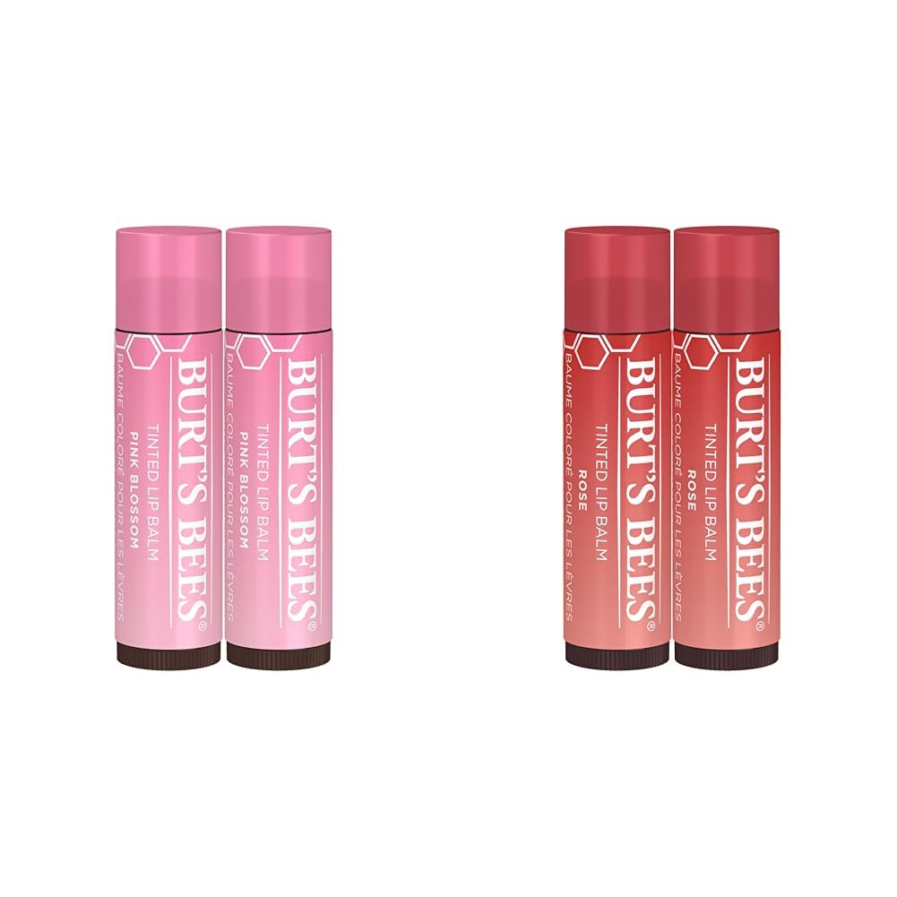 This Burt's Bees lip care bundle includes two 2-packs of tinted lip balms to provide long-lasting moisture and a hint of color for a natural, everyday look. One 2-pack is the Pink Blossom shade with a warm, neutral hue that enhances lips with just the right amount of color while keeping them nourished for up to 8 hours. The smooth texture adds a sheer, natural shade without shimmer. The other 2-pack is the Petal Rose shade with a warm, neutral hue that flatters lips with a subtle wash of color while delivering 8-hour moisture. The smooth texture provides a sheer, natural peach tone without shimmer or pearlescence. Both tinted lip balms are infused with moisturizing shea butter and botanical waxes. They leave lips feeling smooth and refreshed with a lightweight, buildable color that is easy to apply directly from the tube. The two complementary shades have soft, neutral hues that enhance natural lip color. While Pink Blossom has a pink tone, Petal Rose has a peach undertone. Both provide sheer, lightweight color that is subtle enough for everyday wear. Formulated without parabens, phthalates, petrolatum or SLS, these 100 natural origin lip balms revitalize and beautify lips with clean ingredients. The balms can be easily tucked into a pocket or purse to keep lips nourished and presentable all year round.
