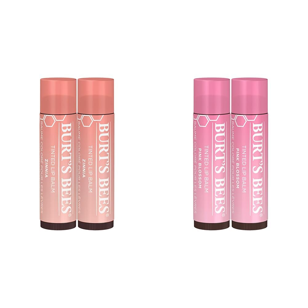 This bundle includes two 2-packs of Burt's Bees Tinted Lip Balms to provide long-lasting color and moisturization for your lips. One 2-pack is in the Raspberry Zinnia shade which is a sheer peach lip tint, and the other is in the Pink Blossom shade which is a warm neutral pink hue. Both tinted lip balms are made with 100 natural origin formulas containing moisturizing shea butter and botanical waxes to nourish dry lips for up to 8 hours per application. The Raspberry Zinnia and Pink Blossom shades provide fabulously flattering colors to naturally enhance your lips with just a hint of color for an easy, everyday makeup look. With this bundle, you can mix and match the two shades or layer them to create your own custom lip look. The creamy, smooth texture glides onto lips, adding sheer color without any shimmer or pearlescence. These tinted lip balms are free of parabens, phthalates, petrolatum and SLS. The recyclable packaging makes these natural beauty products an eco-friendly choice for your makeup routine. With one 2-pack in an orangey-pink and one in a rosy-pink, this bundle offers versatile shades to complement any skin tone.