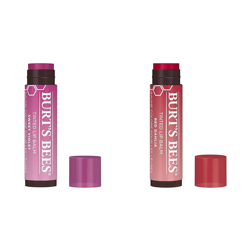 This bundle includes two 2-packs of Burt's Bees tinted lip balms featuring long-lasting, nourishing formulas to provide lips with 8 hours of hydration. One 2-pack is Sweet Violet, which has a warm neutral hue, while the other is Fiery Red Dahlia, which has a sheer, natural peach tone. Both tinted lip balms are made with moisturizing shea butter and botanical waxes to smooth and condition dry, chapped lips. The balms add just a hint of buildable color for an easy, everyday makeup look without shimmer or pearlescence. They feature a lightweight, smooth texture that leaves lips feeling soft. With this bundle, you can mix and match the subtle lip tints to complement different looks. Keep Sweet Violet's neutral tone on hand for a polished touch to casual outfits and Fiery Red Dahlia's peach hue for a pop of color with dressier looks. With two flattering shades, your lips stay nourished around the clock. The balms are formulated without parabens, phthalates, petrolatum or SLS and provide fuss-free, versatile color you can conveniently tuck into a pocket or bag. Pamper your pout with this duo of top-selling tinted lip balms from America's No. 1 dermatologist-recommended natural skin care brand.