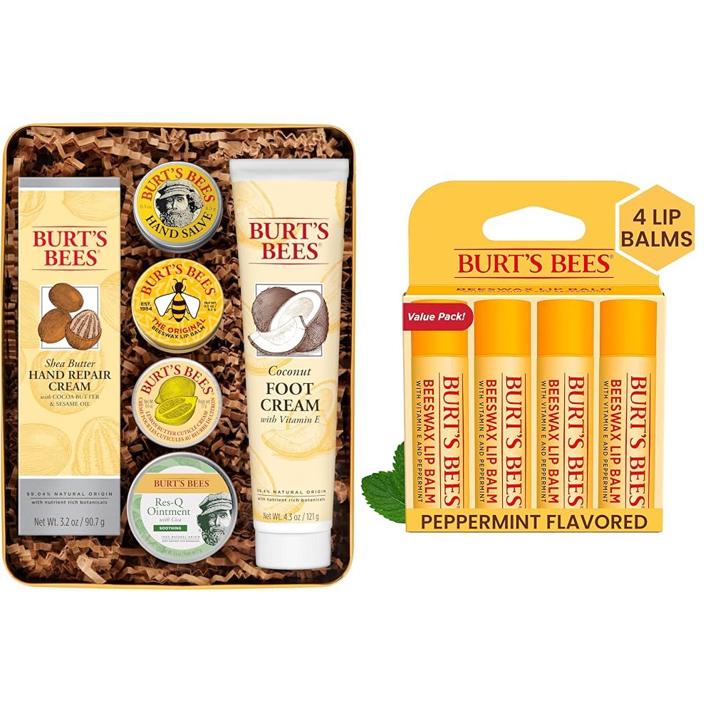 Burt's Bees Classics Valentines Day Gifts Set, 6 Products in Giftable Tin – Cuticle Cream, Hand Salve, Lip Balm, Res-Q Ointment, Hand Repair Cream and Foot Cream Revitalize and infuse your skin with moisture with Burts Bees Classic Gift Set. This 6 piece Classics set includes Lemon Butter Cuticle Cream to nourish and hydrate nails and cuticles Coconut Foot Cream to pamper feet Beeswax Lip Balm to replenish dry lips Classic Hand Salve and Shea Butter Hand Repair Cream to nurture and moisturize dry hands and to nourish and moisturize your dehydrated skin, a tin of Res-Q Ointment. Burts Bees Classics are time tested originals made with the finest ingredients from nature. Indulge your skin with these natural products formulated to help retain moisture and keep your skin soft and supple. This Burts Bees Classics Gift Set is the perfect birthday or holiday present for anyone on your list. The giftable tin is designed to be gift ready so you can skip the wrapping. Give the gift of nourishment with Burts Bees skin care. Burt's Bees Lip Balm Valentines Day Gifts, Original Beeswax, Lip Moisturizer With Responsibly Sourced Beeswax, Tint-Free, Natural Conditioning Lip Treatment, 4 Tubes, 0.15 oz. Burt's Bees Moisturizing Lip Balm nourishes and makes your lips feel luxurious. Infused with power packed Beeswax to condition skin and antioxidant Vitamin E to richly moisturize and soften lips, this lip balm nourishes dry lips while keeping them revitalized and hydrated. With a matte finish and moisturizing balm texture, this tube of soothing lip balm glides on smoothly with a hint of Peppermint Oil which leaves your lips with a refreshing tingle. Conveniently tuck this tube into a pocket or purse, so that you can keep natural, nurturing lip care handy. This 100 natural beauty product is free of parabens, phthalates, petrolatum and SLS and will beautify and revitalize your lips. Use this natural Burt's Bees Moisturizing Lip Balm to make lips feel their best.Product 2: COOLING COMFORT: Made with Beeswax, Vitamin E and a hint of peppermint oil, hydrate and nourish dry lips with the original favorite Burt's Bees lip balm. Product 2: MOISTURIZING LIP CARE: Bursting with minty freshness, refresh and nourish your lips with Burt's Bees Beeswax Moisturizing Lip Balm Package may vary. Product 1: MULTIPURPOSE OITNMENT: This gentle Res-Q Ointment is made with a blend of herbal ingredients to create an everyday salve that soothes and comfort dry skin and minor cuts. Product 1: LIP MOISTURIZER: Made with Beeswax Vitamin E and a hint of peppermint oil hydrate and nourish dry lips with the original favorite lip balm. Product 1: HANDS FEET: Pamper and soothe dry rough cracked skin with moisturizing hand salve cuticle cream hand cream and rich foot cream. Product 1: SKIN CARE PRODUCTS: Pamper from head to toe with this giftable set including Lemon Butter Cuticle Cream, Hand Salve, Original Beeswax Lip Balm, Res-Q Ointment, Shea Butter Hand Repair Cream and Coconut Foot Cream.,.