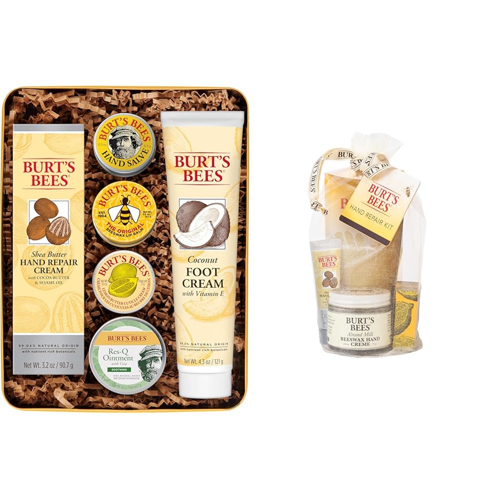 Product 2: HAND CREAM: These two ultra-rich, naturally moisturizing Burt's Bees Hand Creams repair tough, dried out skin from the harsh winter months. Product 2: GIFTS FOR HER: Pamper someone you love with this giftable hand spa kit including Almond Milk Hand Cream, Shea Butter Hand Repair Cream and Lemon Butter Cuticle Cream, plus 1 pair of cotton gloves. Product 1: MULTIPURPOSE OITNMENT: This gentle Res-Q Ointment is made with a blend of herbal ingredients to create an everyday salve that soothes and comfort dry skin and minor cuts. Product 1: LIP MOISTURIZER: Made with Beeswax Vitamin E and a hint of peppermint oil hydrate and nourish dry lips with the original favorite lip balm. Product 1: HANDS FEET: Pamper and soothe dry rough cracked skin with moisturizing hand salve cuticle cream hand cream and rich foot cream. Product 1: SKIN CARE PRODUCTS: Pamper from head to toe with this giftable set including Lemon Butter Cuticle Cream, Hand Salve, Original Beeswax Lip Balm, Res-Q Ointment, Shea Butter Hand Repair Cream and Coconut Foot Cream.,.