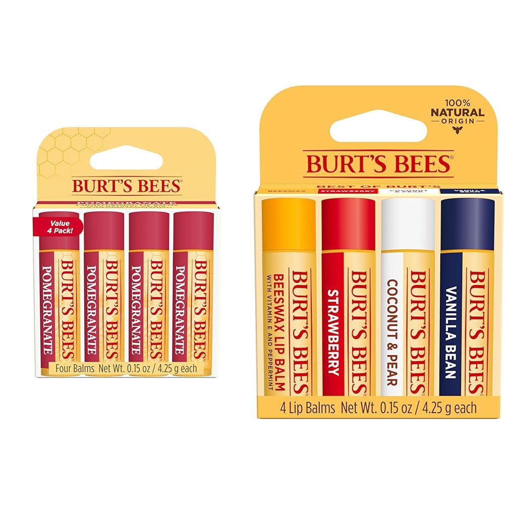 Burt's Bees Lip Balm Valentines Day Gifts, Pomegranate, Lip Moisturizer With Responsibly Sourced Beeswax, Tint-Free, Natural Conditioning Lip Treatment, 4 Tubes, 0.15 oz. Burt's Bees Pomegranate Lip Balm instantly softens and hydrates your lips to help prevent dryness, cracking or chapping. Infused with responsibly sourced beeswax to richly moisturize and soothe lips, the nourishing oils and butters will make your lips juicy, happy and healthy. A matte finish keeps your lips their natural color, while the tint-free tube of lip moisturizer glides on smoothly to pamper dry lips while keeping them protected and hydrated. This lip balm features a hint of pomegranate flavor to delight the senses with a refreshing tropical flavor. Formulated without parabens, phthalates, petrolatum or SLS, this flavored lip balm is 100 natural origin to rejuvenate and beautify chapped lips with clean ingredients. You can conveniently tuck a tube of this moisturizing lip balm into your pocket or purse to keep natural, nurturing lip care at your fingertips. Playing by natures rules since 1984, Burts Bees uses ingredients from nature to nourish and revitalize your skin and lips, making products that have become a staple of your household. Burts Bees is the No. 1 dermatologist-recommended natural skin care brand (1). (1) Based on a September 2021 NielsenIQ national survey of U.S. Dermatologists. Burt's Bees Lip Balm Valentines Day Gifts, Beeswax, Strawberry, Coconut and Pear, and Vanilla Bean Pack, With Responsibly Sourced Beeswax, Tint-Free, Natural Lip Treatment, 4 Tubes, 0.15 oz. Burt's Bees Lip Balm instantly softens and hydrates your lips to help prevent dryness, cracking or chapping. Infused with responsibly sourced beeswax to richly moisturize and soothe lips, the nourishing oils and butters will make your lips juicy, happy and healthy. A matte finish keeps your lips their natural color, while the tint-free tube of lip moisturizer glides on smoothly to pamper dry lips while keeping them protected and hydrated. This pack features four refreshing flavors, including Beeswax, Strawberry, Coconut and Pear, and Vanilla Bean. Formulated without parabens, phthalates, petrolatum or SLS, this flavored lip balm is 100 natural origin to rejuvenate and beautify chapped lips with clean ingredients. You can conveniently tuck a tube of this moisturizing lip balm into your pocket or purse to keep natural, nurturing lip care at your fingertips. Playing by natures rules since 1984, Burts Bees uses ingredients from nature to nourish and revitalize your skin and lips, making products that have become a staple of your household. Burts Bees is the No. 1 dermatologist-recommended natural skin care brand (1). (1) Based on a September 2021 NielsenIQ national survey of U.S. Dermatologists.Product 2: MOISTURIZED LIPS: Each balm is infused with responsibly sourced beeswax, nourishing oils and butter for a conditioning lip treatment that keeps your lips happy, healthy and juicy. Product 2: FLAVORFUL LIP BALM: One package contains four 0.15 oz. lip balm tubes of Burt's Bees Lip Balm in Beeswax, Strawberry, Coconut and Pear, and Vanilla Bean flavors to moisturize and soften your lips. Product 1: NOURISH DRY OR CHAPPED LIPS: The tint-free tube of moisturizing lip balm glides on your lips smoothly to nourish them, keeping lips happy, healthy and hydrated. Product 1: TROPICAL FLAVOR: Delight the senses with a delicious pomegranate flavor that will encourage you to apply this flavored lip balm over and over again. Product 1: MOISTURIZED LIPS: Each balm is infused with responsibly sourced beeswax, nourishing oils and butter for a conditioning lip treatment that keeps your lips happy, healthy and juicy. Product 1: FLAVORFUL LIP BALM: Four 0.15 oz. lip balm tubes of Burt's Bees Pomegranate Lip Balm to moisturize and soften your lips.