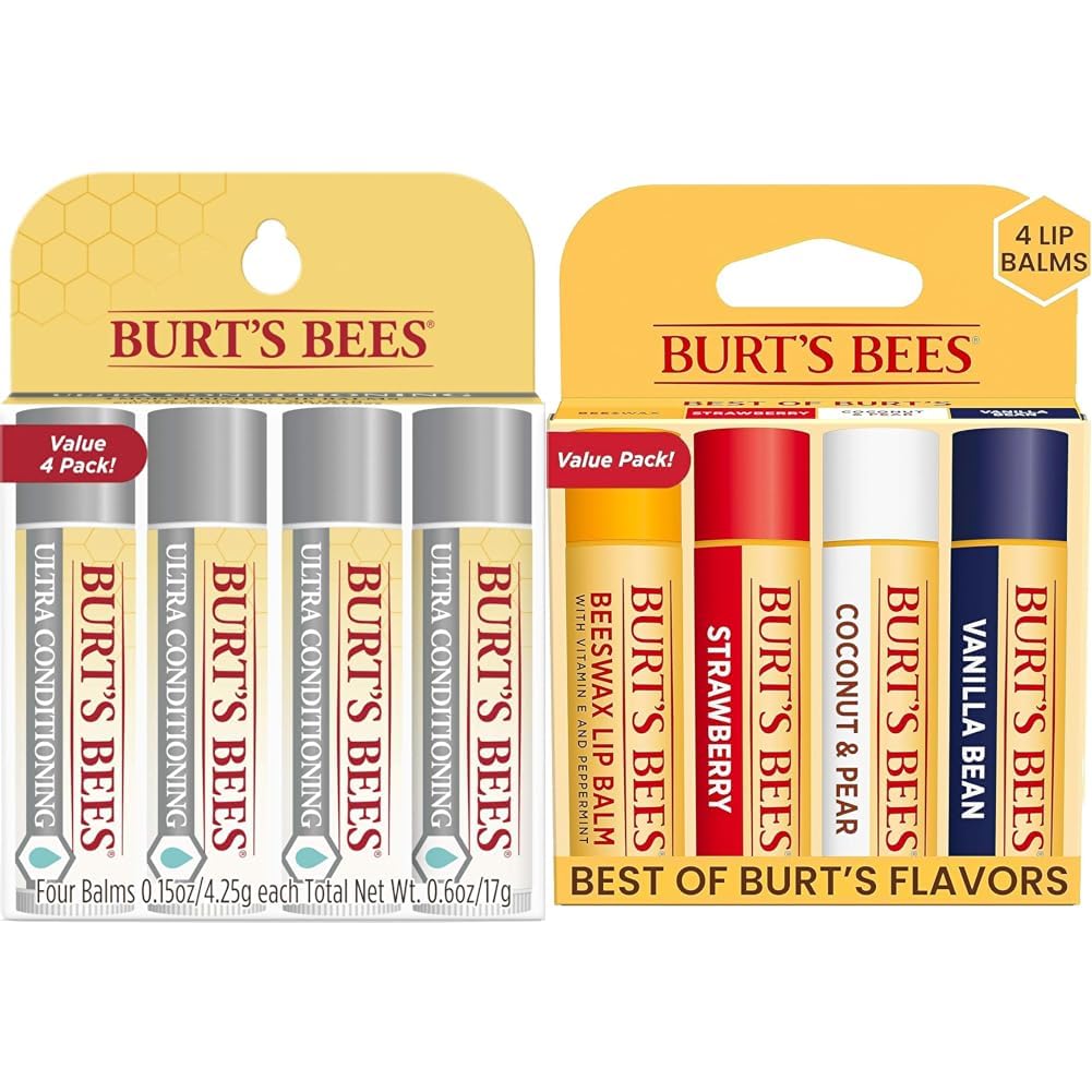 Product 2: MOISTURIZED LIPS: Each balm is infused with responsibly sourced beeswax, nourishing oils and butter for a conditioning lip treatment that keeps your lips happy, healthy and juicy. Product 2: FLAVORFUL LIP BALM: One package contains four 0.15 oz. lip balm tubes of Burt's Bees Lip Balm in Beeswax, Strawberry, Coconut and Pear, and Vanilla Bean flavors to moisturize and soften your lips. Product 1: CONDITIONING LIP THERAPY: The tint-free tube of moisturizing lip balm glides on your lips smoothly, leaving them smooth and refreshed with a matte finish from natural ingredients. Product 1: RICH IN BUTTERS AND OILS: Made with more butters and less wax than other balms, this unflavored lip therapy balm leaves your lips soft and super smooth for up to four hours. Product 1: MOISTURIZED LIPS: Each balm is infused with kokum butter, shea butters and antioxidant-rich marula oil for a conditioning lip treatment that keeps your lips happy, healthy and juicy. Product 1: ULTRA CONDITIONING LIP BALM: One package contains four 0.15 oz. lip balm tubes of Burt's Bees Ultra Conditioning Moisturizing Lip Balm to hydrate and condition dry lips.