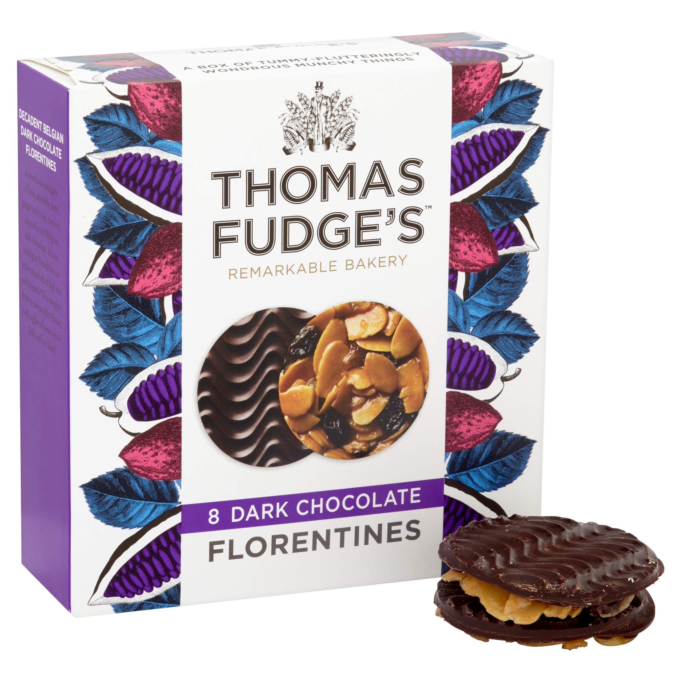 8 Belgian dark chocolate Florentines A captivating collision of fruit, nuts, ginger and caramel, finished with silky Belgian dark chocolate. INGREDIENTS Belgian dark chocolate (28 ) (cocoa mass, sugar, cocoa butter, emulsifier: SOYA lecithin, natural vanilla flavour), almonds (18 ), sugar, butter (milk), cream (milk), glucose syrup, golden syrup (partially inverted raffinas syrup), sultanas, candied mixed peel (orange peel, glucose fructose syrup, lemon peel), ginger stem (1.5 ), salt.Thomas Fudge's Donkere chocolade Florentines 150g (Pack van 8), 18153 8 Belgische donkere chocolade Florentines Een boeiende botsing van fruit, noten, gember en karamel, afgewerkt met zijdezachte Belgische pure chocolade. INGREDIËNTEN Belgische donkere chocolade (28 ) (cacaomassa, suiker, cacaoboter, emulgator: SOYA leecithine, natuurlijke vanille smaak), amandelen (18 ), suiker, boter (melk), crème (melk), glucosestroop, gouden siroop (gedeeltelijk omgekeerde raffina's siroop), sultana's, gekonfijte gemengde schil (sinaasappel Peel, Glucose Fructose siroop, citroenschil), steel gember (1,5 ), zout.