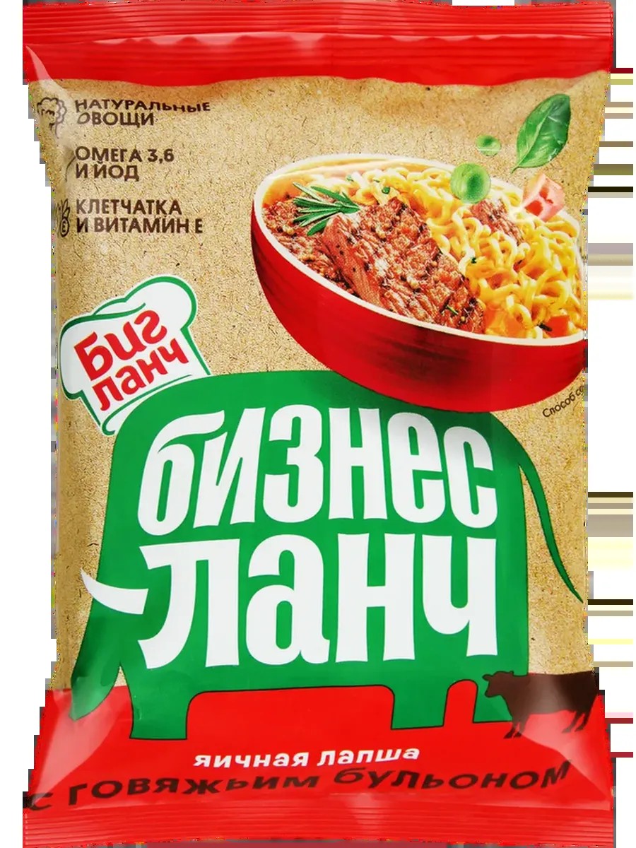 Лапша БИЗНЕС ЛАНЧ Яичная с говяжьим бульоном позволит быстро приготовить сытное и питательное блюдо. Такой продукт выручит в случае нехватки времени, может использоваться в качестве обеда или ужина на работе, в походах, во время поездок. Содержит натуральные овощи, клетчатку, омега 3,6, витамин Е и йод. Достаточно залить лапшу кипящей водой и немного подождать.