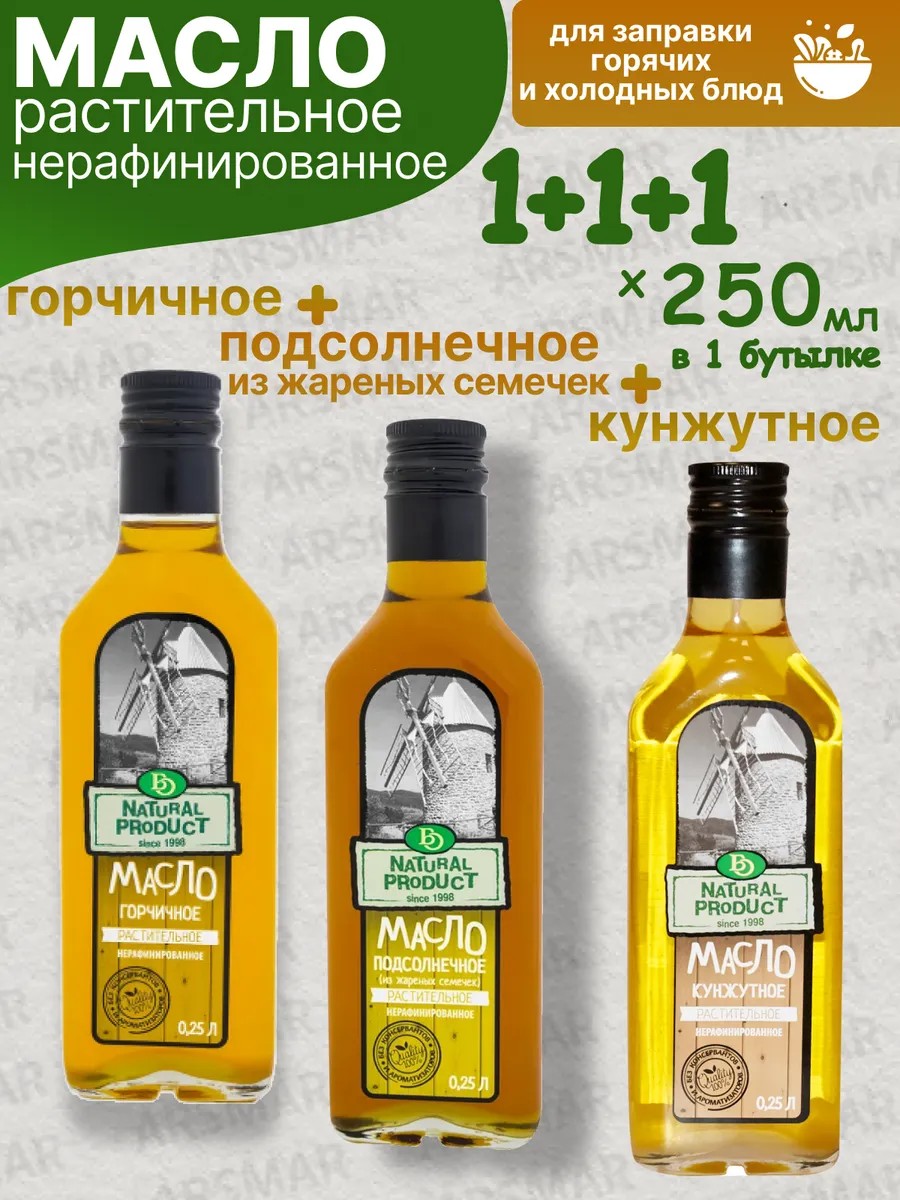 | Состав | масло горчичное холодного отжима нерафинированное; масло подсолнечное нерафинированное; масло кунжутное нерафинированное холодного отжима |