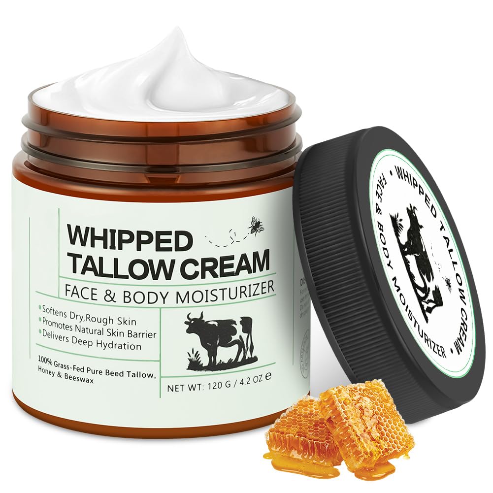 BUTBU Beef Tallow Face Cream, 120 g Appât de bœuf pour la peau, crème de sébum naturelle pour le soin des pieds, avec Tallow Grass Fed et miel, hydratant visage corps 1 pièceMultifonction : une seule bouteille peut répondre aux besoins quotidiens d'hydratation et de nutrition de diverses parties du visage et du corps. Peut être utilisée comme crème pour le visage, lotion pour le corps, crème pour le soin des mains et des pieds, etc. Que ce soit comme base avant le maquillage, comme réparateur de nuit ou pour soulager la rugosité des zones sèches telles que les coudes, les genoux et les talons, elle hydrate efficacement. ABSORPTION RAPIDE La crème au beurre a une texture légère, est facile à appliquer et est rapidement absorbée sans laisser de résidus collants, gras ou lourds, offrant une expérience d'utilisation rafraîchissante et confortable. Convient à tous les types de peau, y compris les graisses. En reconstituant l'eau, elle aide à renforcer la barrière cutanée, à améliorer la capacité de rétention d'eau et à mieux résister aux pressions environnementales externes. Naturel et doux Beurre d'animaux nourris à l'herbe de haute qualité, miel pur et cire d'abeille naturelle comme ingrédients principaux, sans parfums artificiels, sans alcool ni additifs chimiques irritants. Sa formule est pure et douce, et l'effet apaisant naturel du miel et de la cire d'abeille peut soulager délicatement l'inconfort de la peau. Même les peaux sensibles peuvent l'utiliser en toute confiance. Nutrition profonde : le beurre d'animaux nourris à l'herbe est riche en vitamines naturelles A, D, E et K et en acides gras essentiels, qui fournissent une nutrition complète et hydratent la peau en profondeur. Aide à restaurer l'élasticité de la peau et à atténuer les rides d'expression et les rides de sécheresse causées par la déshydratation. Contient du miel, qui adoucit et illumine le teint de la peau, améliore l'opacité et la rugosité et la laisse radieuse et saine de l'intérieur. HYDRATATION INTENSE Pour les problèmes de peau tels que la sécheresse, la peau craquelée et la rugosité, le beurre naturel et la cire d'abeille agissent ensemble pour pénétrer profondément et hydrater la peau, formant un film protecteur sur la surface qui retient l'humidité. Soulage efficacement les tiraillements, améliore continuellement la desquamation et améliore la douceur et la douceur de la peau.