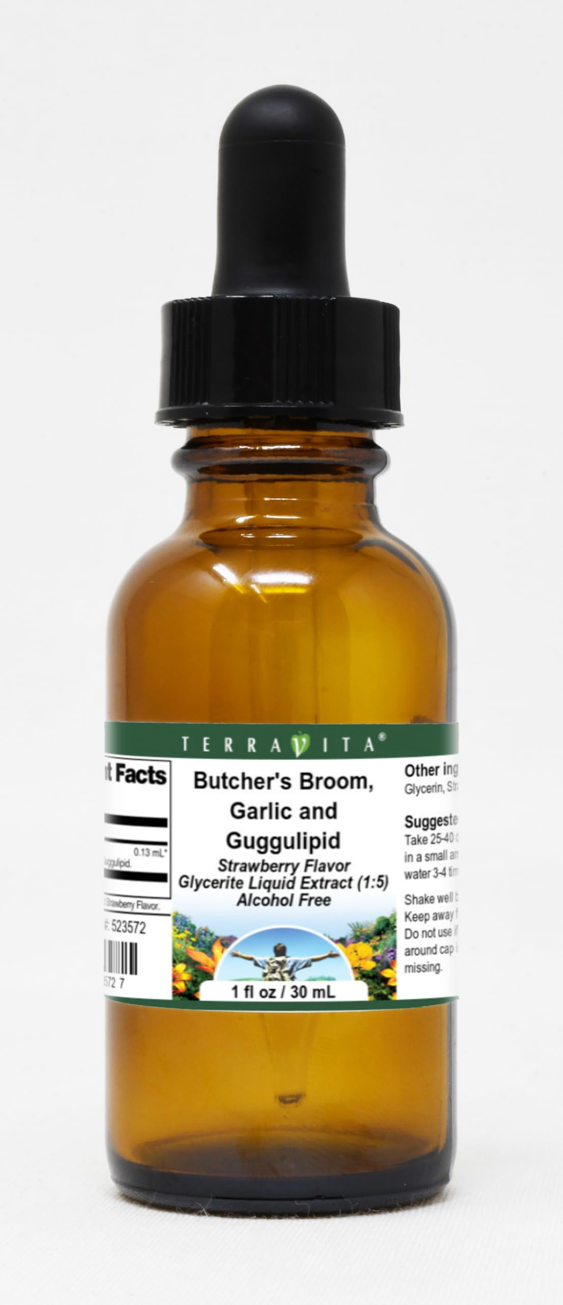 Butcher's Broom, Garlic and Guggulipid Glycerite Liquid Extract (1:5) - Strawberry Flavored (1 oz, ZIN: 523572) Packaged in the United States in a GMP certified facility (Good Manufacturing Practice). No fillers. Manufacturer: TerraVita Size: 1 oz Convenient Liquid format. Ingredients: Artificial Strawberry Flavor, Glycerin (Vegetable Source), Butcher's Broom, Garlic, Guggulipid