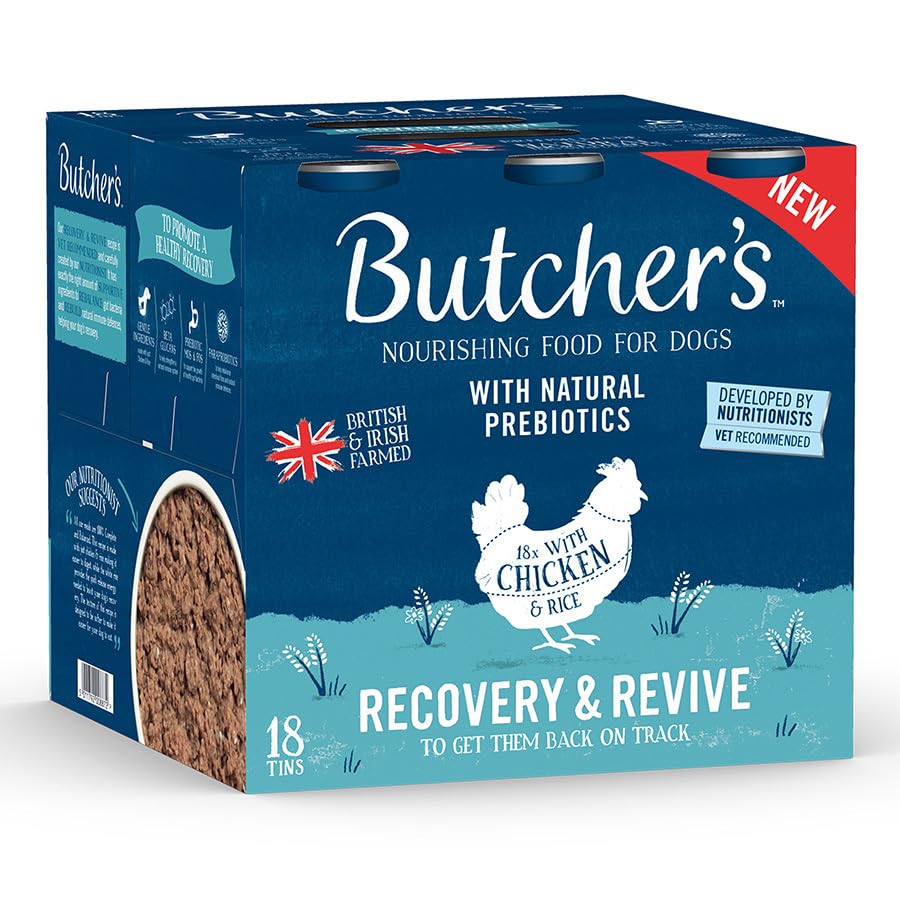 Butcher's Recovery & Revive Wet Adult Dog Food is a nourishing and easily digestible meal designed to support your canine companion's recovery from illness or surgery. Crafted with high-quality chicken and rice, this wet food provides a gentle source of protein and carbohydrates to help replenish their energy levels. The soft, moist texture makes it an ideal choice for dogs with sensitive stomachs or those struggling to eat dry kibble. Each 390g (13.8 oz) can is packed with essential vitamins and minerals to aid in their overall healing process. Whether your furry friend is recuperating from an operation or simply needs a nutritious boost, Butcher's Recovery & Revive Wet Adult Dog Food offers a tasty and comforting meal to support their journey back to full health. Serve it as a complete meal or mix it with their regular dry food for added flavour and moisture. INDICATIONS Recovery and revitalization support in adult dogs INGREDIENTS Composition WITH CHICKEN: British and Irish Farmed Chicken 50%, Broth 39.5%; including Water and Dried Seaweed, Cooked White Rice 7.5%, Salmon Oil 1%, Minerals, Yeast 0.15%; including Prebiotic MOS 0.05% and Beta-Glucans 0.045%, Chicory Root; Prebiotic FOS 0.06%, Yucca 0.005%, Paraprobiotic Lactobacillus helveticus 0.001% Analytical Constituents: Protein: 8%; Crude Fibres: 0.2%; Crude Oils and Fats: 7%; Crude Ash: 2.5%; Moisture: 82%; Omega (3 and/or 6): Not Stated; Calcium: Not Stated; Phosphorus: Not Stated Additives Nutritional Additives and Trace Elements: Vitamin A 1,250 I.U.,