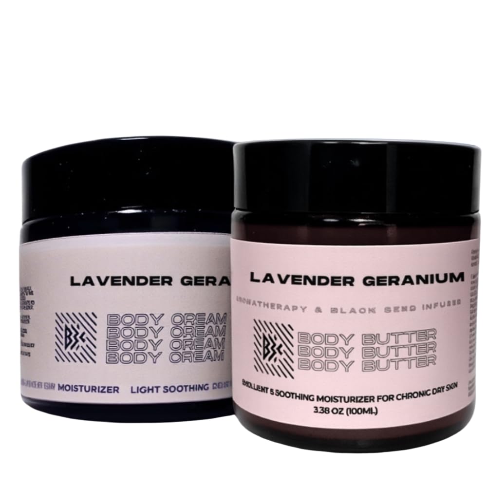 Luxurious Texture: A luxurious texture that glides smoothly onto the skin. It absorbs easily, leaving no greasy residue and allowing you to enjoy the moisturizing benefits without any discomfort. Best when applied in small dabs to damp skin. Aromatherapy Benefits: The light calming scents of these botanicals can help promote a sense of well-being, reduce stress, and enhance your overall mood. Gentle and Soothing for the Skin: Suitable for sensitive skin, our Lavender and Geranium infused body butter is gentle helps soothe dryness, visable ash and flaking leaving your skin feeling comforted and nourished. Deeply Moisturizing: Formulated with nourishing ingredients, our body butter delivers deep hydration to the skin. It helps to replenish and restore moisture, leaving your skin feeling soft, and supple. Relaxing and Calming: Our Lavender and Geranium infused body butter is designed to provide a truly relaxing and calming experience. This infusion of certified aromatherapy and perfumery guarantees a quality product that promotes relaxation and a heightened sense of well-being.