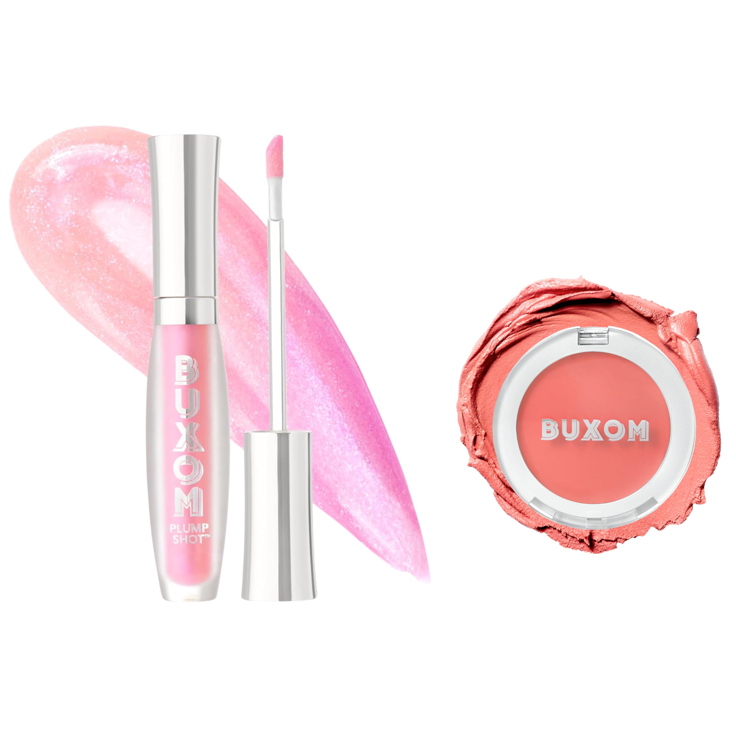 Buxom Plump Shot Collagen-Infused Lip Serum in Spellbound Pink Multichrome + Plump Shot Collagen Peptides Plumping Cream Blush Cream-to-Powder Blush in shade Coral Sheer