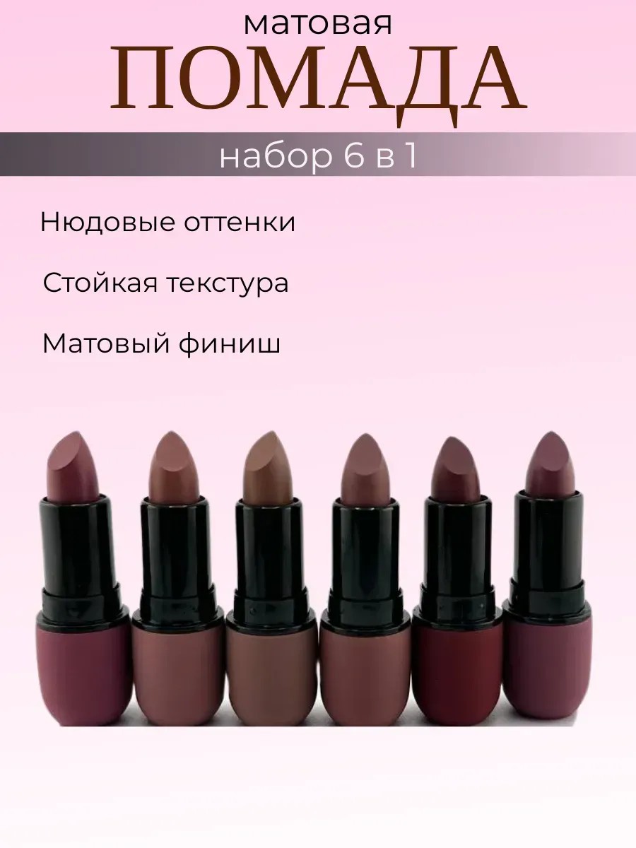 Набор включает 6 матовых помад с бархатной текстурой. Подходят для дневного и вечернего макияжа. Косметика для губ, стойкая помада, матовая помада для губ, стойкий макияж губ, бархатная помада, набор помад, помада 6 штук, стильная помада, подарок для девушки.