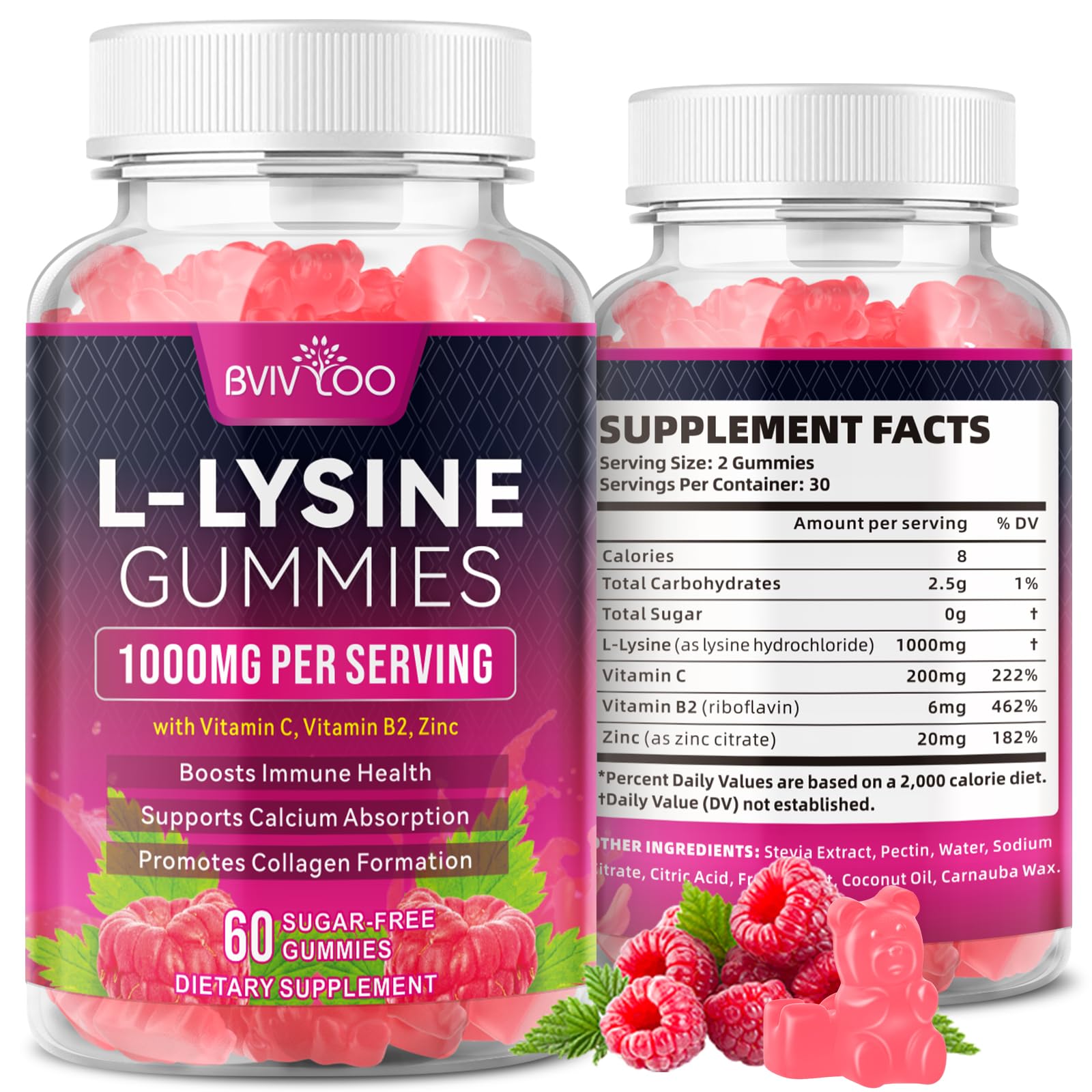 BVIVLOO L-Lysine 1000mg Gummies for Immune Support & Skin Health - High Potency Vegan Sugar-Free Gluten-Free Supplement with Natural Raspberry Flavor for Adults & Kids - 60 Gummies