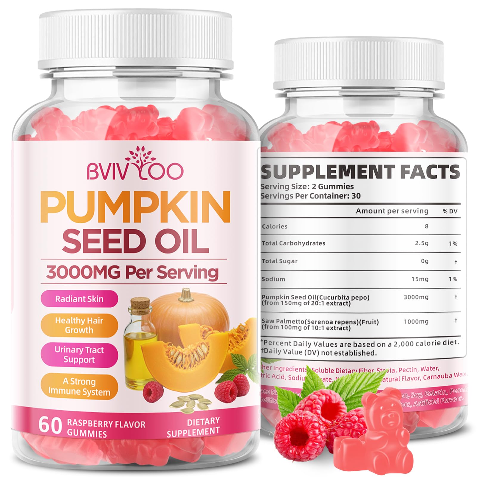 BVIVLOO Pumpkin Seed Oil Gummies with Saw Palmetto Organic Pumpkin Seed Oil Supplement High-Purity Extract for Hair Growth Skin Health & Immune Support Raspberry Flavor 60 Count
