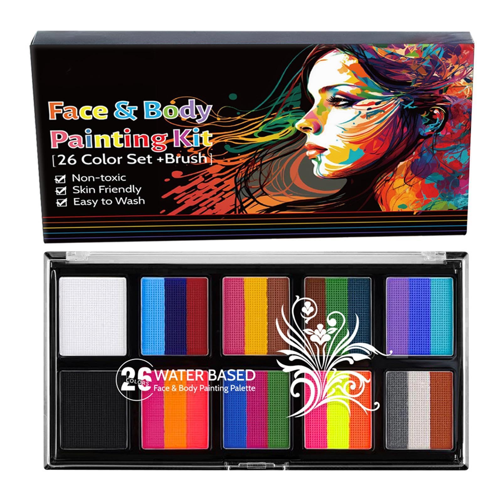 Wonderful choice: Ideal for theme parties, cosplay, and creative days, this face paint is also perfect for carnivals, Christmas, Easter, masquerades, birthday parties, Halloween, school events, and music festivals. Easy removal: Create stunning Halloween looks with our all-water-based face paint, easily cleaned with warm soapy water or a damp cloth effortlessly remove in just 8-10 brush dips. Easy to use: Easily achieve vibrant and spooky makeup using our Halloween face paint. Simply mix with water, spray on the desired color, and apply evenly with the brush. Gentle on skin, safe for: With mild ingredients, this face paint palette is safe and gentle before use, perform a short patch test. Suitable for children and adults. As everyone's skin is different, it's safest to test a small area first. Wide range of uses: Show your patriotism with our flag-inspired cake topper palette. Whether for Halloween or a parade, this professional rainbow makeup kit will make your creations stand out with beautiful rainbow designs.Bvizyelck Poudre de pigment de peinture, ensemble de peinture pour le visage,Peinture pour le visage à base d'eau sûre Peinture pour le corps lavable - Poudre pigmentée 26 couleurs pour le visage, kitMerveilleux choix : idéal pour les soirées à thème, le cosplay, la journée des et les personnes créatives, cette peinture pour le visage est également idéale pour le carnaval, Noël, Pâques, la mascarade, les fêtes d'anniversaire, Halloween, les événements scolaires et les festivals de musique. Retrait simple : créez de superbes looks d'Halloween avec notre peinture pour le visage entièrement à base d'eau, facile à nettoyer avec de l'eau chaude savonneuse ou un chiffon humide démaquillez-vous sans effort en seulement 8 à 10 trempages de pinceau. Utilisation facile : obtenez facilement un maquillage vibrant et effrayant en utilisant notre peinture pour le visage d'Halloween. Mélangez simplement avec de l'eau, vaporisez sur la couleur souhaitée et appliquez uniformément avec le pinceau. Douce pour la peau, sans danger pour : avec des ingrédients doux, cette palette de peinture pour le visage est sûre et douce utilisation, faire un court test de tolérance, adapté aux et aux adultes, la peau de chacun étant différente, il sera plus sûr de tester une partie de la peau. Utilisations larges : montrez votre patriotisme avec notre palette de gâteaux divisés inspirée du drapeau. Que ce soit pour Halloween ou un défilé, ce kit professionnel de maquillage arc-en-fera ressortir vos créations avec de magnifiques motifs arc-en-.