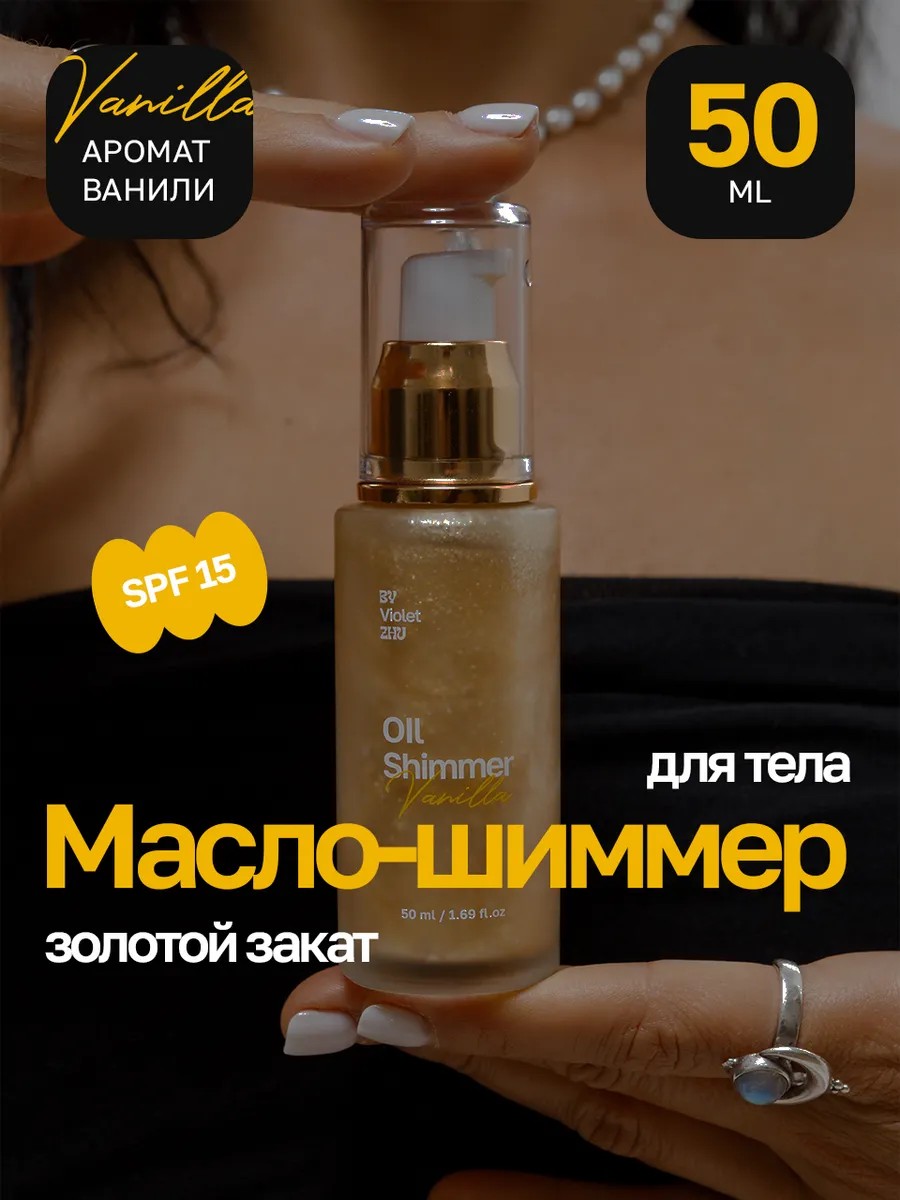 Лето, солнце, пляж.... Чего-то не хватает? Масло для тела с шиммером SPF 15. Шиммер для тела с загаром и волнующим ароматом ванили By VioletZhu для создания эффектного и блестящего образа. Парфюмированный спрей с блестками оставляет приятный шлейф аромата. Уходовая косметика обеспечивает комплексный уход за телом. Масло ши в питательном масле для тела глубоко питает и разглаживает кожу, оказывает anti-age эффект. Масло семян подсолнечника увлажняет и восстанавливает даже самую сухую кожу. Кокосовое масло в масле с СПФ успокаивает, увлажняет и поддерживает защитные свойства кожи. Масло для тела SPF 15 богато витаминами А, Е, B6, B9, PP - оказывают разностороннее положительное влияние на кожу, помогая ей оставаться здоровой, молодой и сияющей. Увлажняющее масло шимер с физическим УФ-фильтром диоксид титана отражает и рассеивает УФ-лучи и защищает кожу от солнечных ожогов и преждевременного старения.