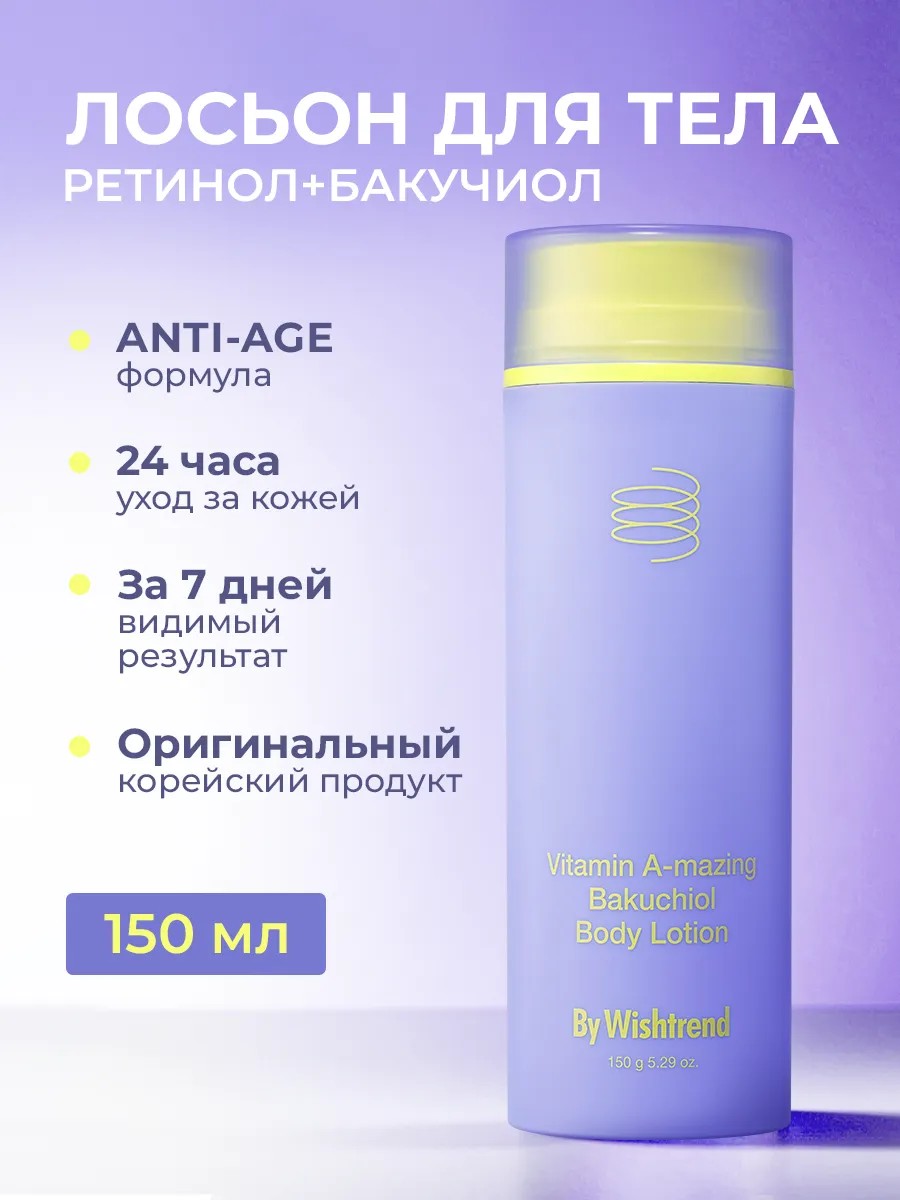 Лосьон для тела By Wishtrend Vitamin A-mazing Bakuchiol Body Lotion разглаживает кожу, смягчает шелушения и огрубевшие участки, мягко осветляет пигментацию и выравнивает тон.