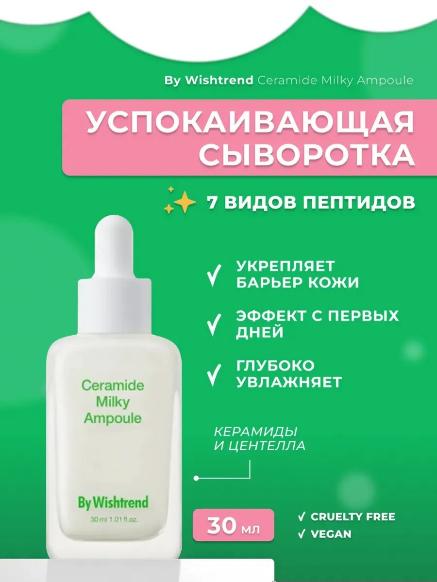 By Wishtrend Cera-barrier Soothing Ampoule.Новая успокаивающая ампула с комплексом CeraBalanceна основе симбиоза Центеллы, Керамидов и Пептидов заботиться о спокойствии и целостности кожи. Снимает покраснения, раздражения, в том числе на месте воспалений, ускоряет заживление любых повреждений, защищает и восстанавливает барьер, уменьшает реакцию кожи на раздражение и аллергены, оказывает антиоксидантное действие и предупреждает возрастные изменения. Легкая молочковая текстура идеально впитывается без утяжеления, забивания пор и ощущения пленки. Эта безопасная для чувствительной кожи ампула протестирована и доказала, что,- Не вызывает комедонов на склонной к акне коже, где количество прыщей и кожного сала значительно сократилось за 4 недели.- Уменьшает потерю воды кожей и успокаивает раздраженную кожу на 67,34% за 6 дней. - Устраняет покраснения кожи от химических веществ на 75,93% за 6 дней. - Улучшает общее состояние кожи, заметно повышает увлажнение кожи иуспокаивает чувствительность кожи и не вызывает раздражения. Легкая молочно-облачная текстура успокаивающей ампулы Cera-barrier впитывается, не оставляя липких следов. Идеальная дневная и ночная ампула для увлажнения, восстановления и питания кожи.