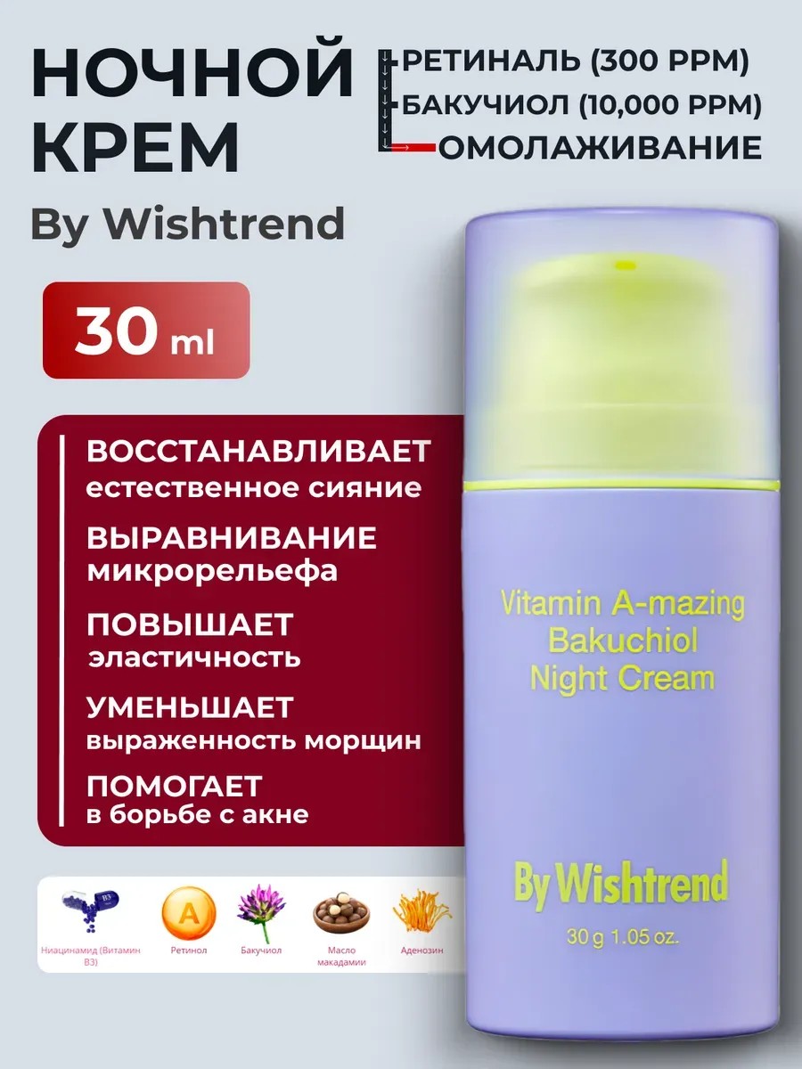 Питательный ночной крем для лица от пигментации с бакучиолом и витамином А By Wishtrend Vitamin A-mazing Bakuchiol Night Cream это увлажняющий крем для кожи с первыми признаками старения. Средство наносится толстым слоем и плотно прилегает к поверхности кожи. Во время сна кровоток усиливается, это приводит к активной выработке коллагена. Средство восстанавливает поврежденную кожу, уменьшает морщины и пигментные пятна. Основные компоненты by wish trend бакучиол: витамин А (ретинол) и бакучиол, которые действенно замедляют процессы старения кожи.Не рекомендуется использовать с продуктами с высоким содержанием витамина С и другими отшелушивающими средствами. Рекомендуется для ночного использования.При использовании в дневное время используйте солнцезащитные средства.Преимущества использования:- питает и смягчает кожу.
