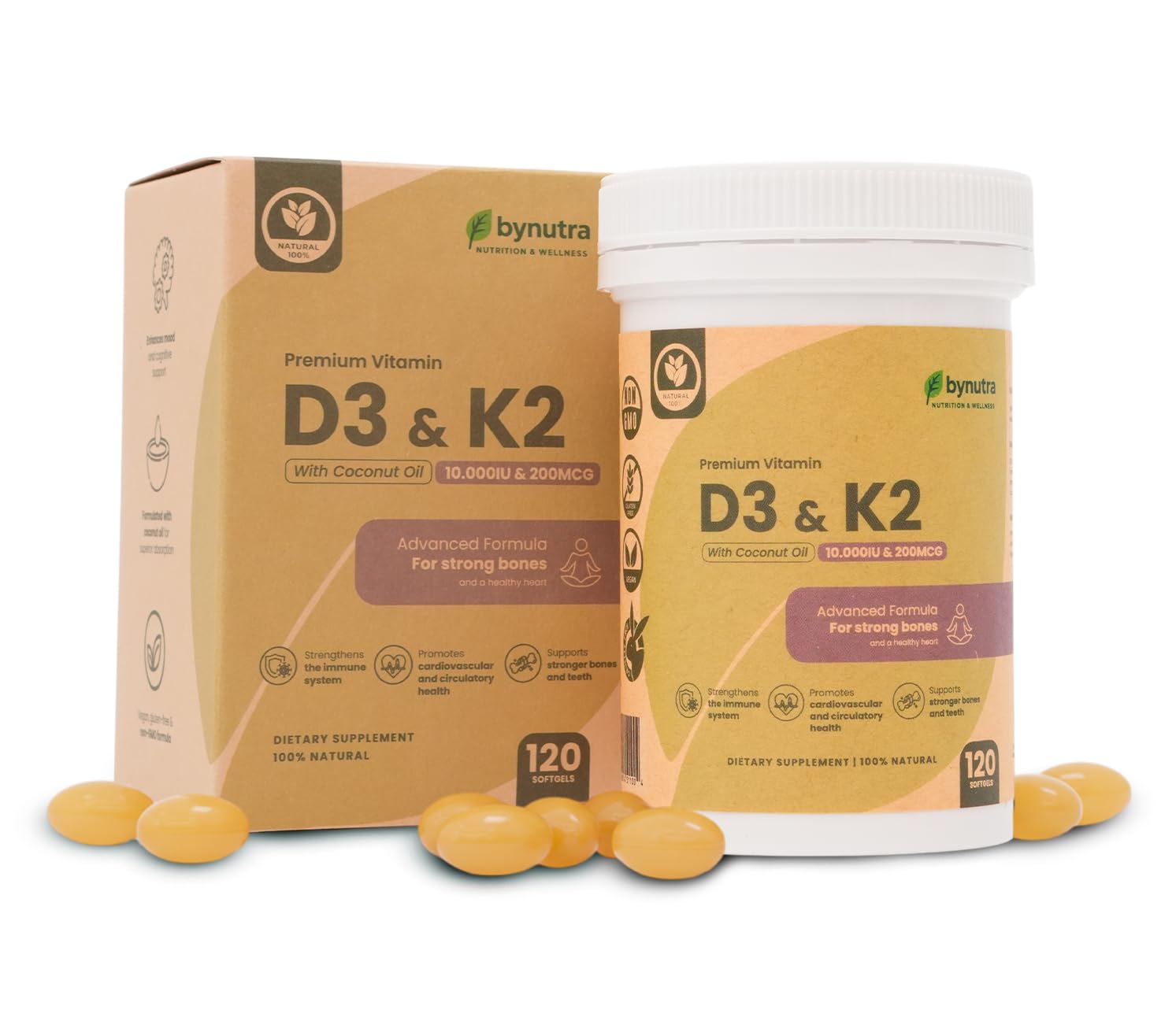 BYNUTRA Premium Vitamin D3 & K2 with Coconut Oil 10 000 IU D3 + 200 mcg MK-7 High-Potency Vitamin D3 K2 Supplement 120 Softgels