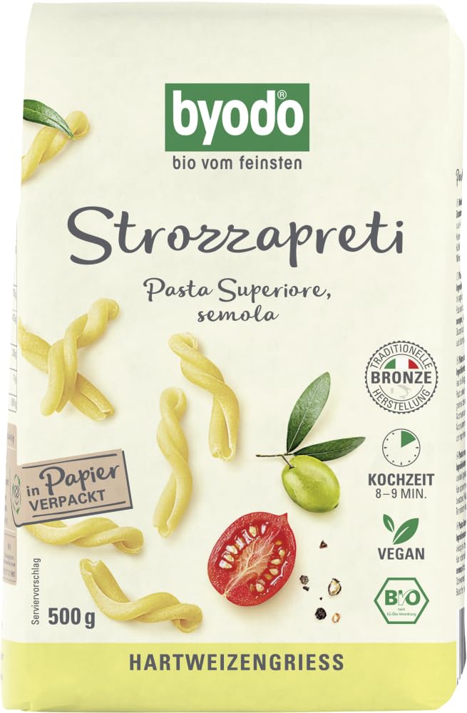 Flavor: Storage and Use: Store in a cool, dry place. Finish: Byodo Strozzapreti pasta captivates all pasta lovers with their delicious taste and twisted shape. They are so appealing that even the Roman poet Giuseppe Gioachino Belli mentioned them fondly in a sonet in 1834. Less picturesque is their name, which comes from the accounts of priests. Having eaten so much of them, they were nearly choked by their curdling properties. These twisted pastas from Emilia-Romagna and Tuscany have a truly delicious taste and are completely harmless. They pair wonderfully with sauces and stews. For Byodo's deliciously chew-resistant pasta, several varieties of premium Italian wheat semolina are combined. They are showcased in a perfectly balanced and carefully maintained blend. The secret to these wonderfully yellow pastas also lies in the slow milling of the grains. This means less heat than usual affects the grain, preserving its delicious taste and delicate aroma. Mixed with crystal-clear water and slowly dried after processing, they become a true delight. All of this also ensures exceptionally good cooking properties and a perfect al dente texture. Thanks to the use of bronze dies, the surface of the pasta is lightly scoured, allowing the sauce to retain its flavor. Serving suggestions: Byodo Strozzapreti, 100 organic durum wheat semolina, is a wonderful treat. Traditionally, they are enjoyed with vegetable sauces or classic stews. Certifications: EU organic label, German organic label. INGREDIENTS WHEAT GRAY COOKING INSTRUCTIONS Byodo Strozzapreti, 100 organic semolina, is a delightful treat with its al dente texture. Traditionally, they are enjoyed with vegetable sauces or classic stews. Byodo Strozzapreti semolina, made from 100 organic durum wheat, is a delicious treat with its al dente texture. Traditionally, they are enjoyed with vegetable sauces or classic stews. SAFETY WARNING Allergy Information: YES (included depending on the recipe): cereals containing gluten, wheat See moreByodo Strozzapreti clair bio (2 x 500 g)DESCRIPTION DU PRODUIT DESCRIPTION DU PRODUIT Saveur : conservation et utilisation : conserver dans un endroit frais et sec. Finition : les Byodo Strozzapreti font tourner la tête de tous les fans de pâtes avec leur goût délicieux et leur forme torsadée. Ils séduisent par le fait que même le poète romain Giuseppe Gioachino Belli les a mentionné avec amour dans un sonet en 1834. Moins de pittoresque est son nom qui se traduit par les témoignages des prêtres. Comme ils en ont mangé tellement avec rigueur, ils sont presque étouffés par leur guéridité. Avec dévouement, les pâtes torsadées de l'Emilia Romagna et Toscane ont un goût absolument délicieux et sont absolument inoffensives. Vous pouvez déguster merveilleusement avec des sauces et ragoûts. Pour les pâtes délicieusement résistantes aux morsures de Byodo, plusieurs variétés de semoule de blé italien de qualité supérieure sont combinées. Ils sont mis en valeur dans un rapport de mélange parfaitement adapté et bien gardé. Le secret de ces pâtes merveilleusement jaunes réside également dans une mouture lente des céréales. Ainsi, moins de chaleur que d'habitude agit sur le grain et préserve le goût délicieux et le parfum délicat. Mélangé avec de l'eau cristalline et séché lentement après le traitement, ce qui en fait un véritable plaisir. Tout cela assure également des propriétés de cuisson particulièrement bonnes et une morsure parfaite en al dente. Grâce à l'utilisation de matrices en bronze, la surface des pâtes est légèrement grattée et la sauce reste particulièrement délicieuse. Finitions et préparation : les Byodo Strozzapreti, semola en semoule de blé dur 100 biologique sont un plaisir merveilleux. Traditionnellement, ils sont dégustés en combinaison avec des sauces aux légumes ou des ragoûts classiques. Certifications en UE label bio allemand allemand INGRÉDIENTS GRIS DE BLÉ MODE D'EMPLOI Le Byodo Strozzapreti, semola 100 biologique, est un délicieux plaisir avec sa bouche al-dente. Traditionnellement, ils sont dégustés en combinaison avec des sauces légumes ou des ragoûts classiques. Les semola Byodo Strozzapreti, 100 de grès dur biologique, sont un délicieux plaisir avec leur touche al-dente. Traditionnellement, ils sont appréciés en combinaison avec des sauces légumes ou des ragoûts classiques. AVERTISSEMENT DE SÉCURITÉ Informations sur les allergies : OUI (inclus selon la recette): céréales contenant du gluten, blé Voir plus