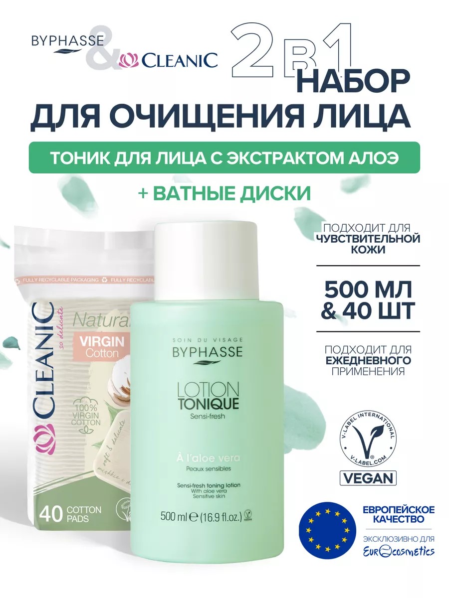 Состав набора: тоник для лица Byphasse с алоэ вера для сухой и чувствительной кожи 500 мл и квадратные ватные диски Cleanic Naturals Virgin Cotton из 100% хлопка 40 шт. Тоник для лица c соком алоэ вера от испанского бренда Бифаз смягчает кожу, очищает от загрязнений, не раздражая ее, придает свежесть и сияние. Уходовое средство обеспечивает борьбу с несовершенствами: устранение остатков очищающих средств и загрязнений, сухости и шелушений, тусклого тона кожи. Тоник для снятия остатков макияжа направлен на увлажнение и питание, выравнивание глубоких мимических морщин. Кожа остается чистой и подготовленной для следующей стадии ухода за лицом - нанесения сыворотки и крема. Тонизирующий лосьон с алоэ вера, обладает увлажняющими и защитными свойствами, специально разработан для чувствительной, сухой кожи. В состав лосьона входит алоэ вера, которая заживляет кожу, устраняет воспаления и сохраняет кожу увлажненной. Не сушит кожу и восстанавливает естественный баланс pH 5,5. Большой объем 500 мл тоника для лица позволит надолго забыть о покупке нового средства. Способ применения: нанесите ватным диском на лицо, контур глаз и шею после снятия макияжа. Не содержит: мыло, красители, парабены, спирт. Ватные диски квадратные большого размера (7,5 х 6 см) мягкие и деликатные ватные диски для ежедневного очищения кожи лица, шеи и зоны декольте. Изготовлены из 100% высококачественного хлопка натурального кремового цвета. Вельветовая поверхность диска эффективно собирает загрязнения, а мягкий край обеспечивает комфорт при очистке деликатной области вокруг глаз. Упаковка дисков полностью пригодна для переработки. Byphasse – это испанский бренд уходовой косметики европейского качества по доступным ценам.