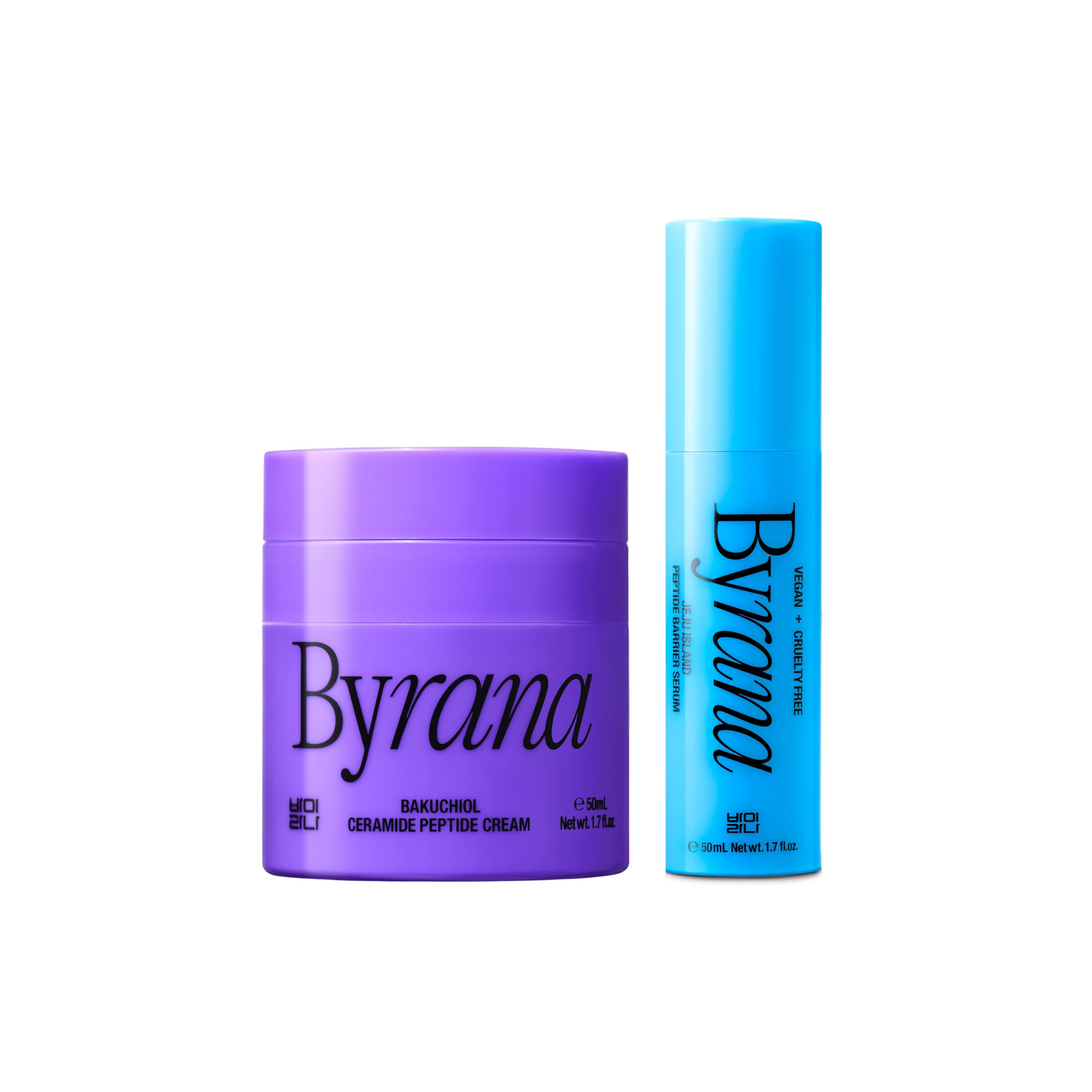Elevate your skincare routine with BYRANA Ultimate Barrier Solution Duo, a complete two-step Korean ritual powered by a Lipid Ceramide Complex and 9 Peptides to strengthen the skin barrier and lock in lasting hydration. Step 1, Jeju Island Peptide Barrier Serum, delivers deep moisture and clarity with Marine 16 Complex, Niacinamide, and Tranexamic Acid. Step 2, Bakuchiol Ceramide Peptide Cream, seals in nourishment with fermented Black Ginseng and Adenosine for smooth, supple, and resilient skin.Clean, vegan, and cruelty-free formulas created in Korea, free from parabens, silicones, PEGs, and mineral oil, and packaged with eco-friendly materials for conscious skincare. Formulated with advanced peptide science and Korean skincare heritage, Fermented Black Ginseng, Bakuchiol, and Marine Actives help restore hydration, smoothness, and youthful resilience. This two-step Korean skincare ritual is powered by a Lipid Ceramide Complex and 9 Peptides that work together to strengthen, replenish, and protect the skin barrier for a supple, healthy-looking glow. Bakuchiol Ceramide Peptide Cream deeply nourishes with fermented Black Ginseng, Bakuchiol, and Adenosine to visibly improve firmness, elasticity, and long-lasting moisture. Jeju Island Peptide Barrier Serum delivers refreshing hydration with Marine 16 Complex, 9 Peptides, and Ceramides to strengthen the skin barrier and reveal a smoother, more balanced complexion.