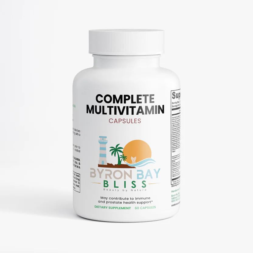 Byron Bay Bliss Complete Multivitamin delivers comprehensive nutritional support in a convenient two-capsule daily serving. This advanced formula goes beyond basic vitamins and minerals, combining essential nutrients with targeted health blends to support your overall wellness. Each bottle contains 60 capsules, providing a full month's supply when taken as directed. The formula features a complete spectrum of vitamins A through E, including a full B-complex with B1, B2, B3, B5, B6, B12, biotin, and folate, plus essential minerals like calcium, magnesium, zinc, selenium, copper, manganese, chromium, and molybdenum. What sets this multivitamin apart is its specialized blend of natural ingredients: a Health Support complex with lutein, lycopene, stinging nettle extract, and palmetto an Immune Support blend featuring echinacea extract, beta glucan, spirulina, and garlic and an Antioxidant Fruit and Energy Blend with green tea extract, hawthorn berries, cinnamon bark, bilberry, grape seed, black currant, and pomegranate extracts. Made with natural ingredients in the USA, these easy-to-swallow vegetable capsules are cruelty-free. Simply take two capsules in the morning with a meal to support your daily nutritional needs.EASY TO TAKE: Convenient vegetable capsules with suggested use of two capsules daily with a morning meal. Contains 60 capsules per bottle, manufactured in the USA with natural ingredients. SPECIALIZED HEALTH SUPPORT: Contains lutein, lycopene, stinging nettle extract, and palmetto to promote prostate health, eye health, and metabolic function. POWERFUL ANTIOXIDANTS: Includes green tea extract, grape seed, pomegranate, bilberry, and black currant fruit extracts to help combat free radicals and support healthy aging. IMMUNE SUPPORT BLEND: Features echinacea extract, beta glucan, spirulina, and garlic to help strengthen your body's natural defense system and promote optimal immune function. COMPREHENSIVE FORMULA: Complete multivitamin with essential vitamins A, C, D, E, and full B-complex plus minerals including calcium, magnesium, zinc, and selenium to support overall health and wellness.
