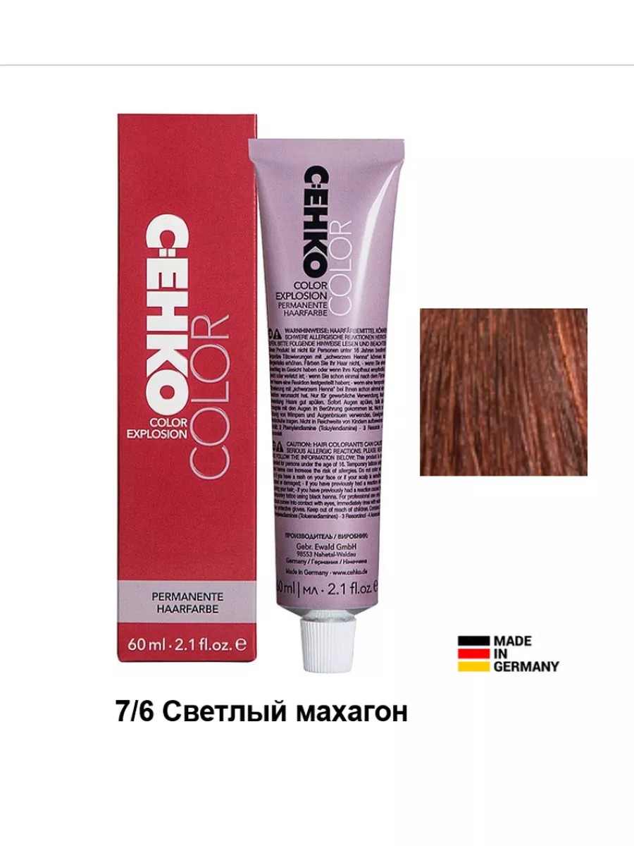 Крем-краска для профессионального окрашивания волос Cehko Color, Color Explosion 60 ml Профессиональная линия красок Cehko (C:EHKO, C:ehko), оттенок 7/6 Светлый махагон (Light Mahogany, Hellmahagoni).Деликатно подобранная формула обогащена натуральными компонентами, такими как масло жожоба, креатин и миндальный протеин, так же содержит витамин С и ненасыщенные жирные кислоты. Натуральные ингредиенты оказывают укрепляющее действие на структуру локонов, ухаживает за волосами во время окрашивания. Они помогают не только получить яркий и насыщенный цвет, но и выровнять структуру волос. Крем-краска с легкостью покрывает 100 % седых волос. Продукт очень удобен в применении и обладает широкой палитрой - более 120 оттенков, насыщенных, стойких и богатых оттенков. Уровень – РН 9,5-11,5. Не содержит микропластик.