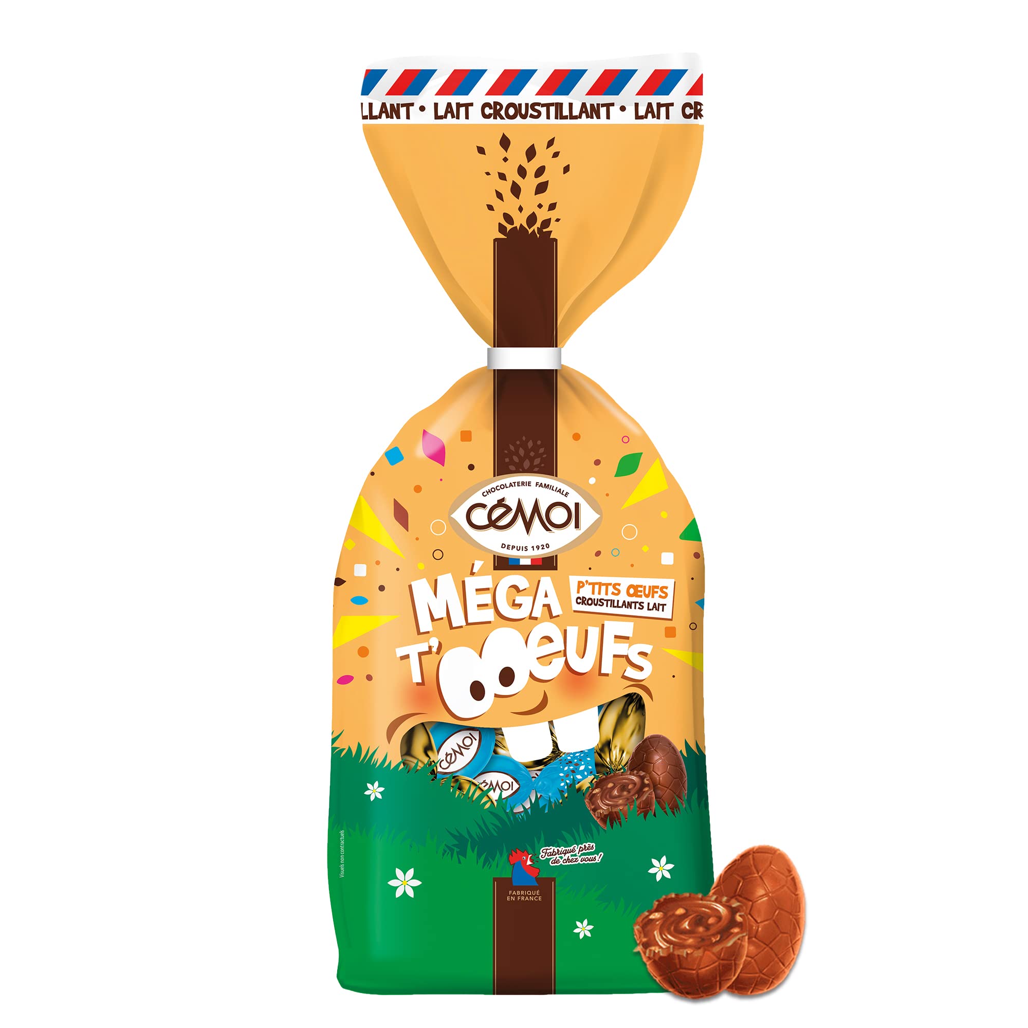 : A more indulgent Easter egg hunt with Mega Eggs! Discover colorful eggs and a variety of recipes in a generous size, perfect for sharing with the family! Product made in France at our chocolate factory in Troyes. Ingredients: Milk chocolate (sugar, whole MILK powder, cocoa butter, cocoa mass, emulsifiers: lecithins - polyglycerol polyricinoleate, natural vanilla flavoring), sugar, vegetable fats (palm kernel, palm), praline 9 (HAZELNUT paste, sugar), LACTOSE, WHEY powder, crispy cereals 2 (rice flour, WHEAT flour, WHEAT gluten, sugar, WHEAT malt, emulsifier: lecithins, salt), fat-reduced cocoa powder, sunflower and or rapeseed oil, emulsifier: lecithins, natural flavoring. Milk chocolate: 26 cocoa minimum. May contain other TREE NUTS. P.when('A').execute(function(A) { A.on('a:expander:toggle_description:toggle:collapse', function(data) { window.scroll(0, data.expander. expander[0].offsetTop-100) }) }) Instructions: Consume as a treat, ideally with a glass of milk or coffee. See moreA more indulgent Easter egg hunt with Mega Eggs! Discover colorful eggs and a variety of recipes in a generous size, perfect for sharing with the family! Product made in France at our chocolate factory in Troyes.Description du produit Une chasse aux œufs plus gourmande avec Méga T'oeufs ! Retrouvez des œufs colorés et des recettes variées dans un format généreux, pour des moments de partage en famille! Produit fabriqué en France dans notre chocolaterie de Troyes. Ingrédients Chocolat au lait (sucre, poudre de LAIT entier, beurre de cacao, pâte de cacao, émulsifiants : lécithines - polyricinoléate de polyglycérol, arôme naturel de vanille), sucre, graisses végétales (palmiste, palme), praliné 9 (pâte de NOISETTES, sucre), LACTOSE, LACTOSERUM en poudre, céréales croustillantes 2 (farine de riz, farine de BLE, gluten de BLE, sucre, malt de BLE, émulsifiant : lécithines, sel), cacao maigre en poudre, huile de tournesol et ou colza, émulsifiant : lécithines, arôme naturel. Chocolat au lait : 26 de cacao minimum. Peut contenir d'autres FRUITS A COQUE. P.when('A').execute(function(A) { A.on('a:expander:toggle_description:toggle:collapse', function(data) { window.scroll(0, data.expander. expander[0].offsetTop-100) }) }) Mode d'emploi Consommer en tant que friandise, idéalement avec un verre de lait ou de café. Voir plusUne chasse aux œufs plus gourmande avec Méga T'oeufs ! Retrouvez des œufs colorés et des recettes variées dans un format généreux, pour des moments de partage en famille! Produit fabriqué en France dans notre chocolaterie de Troyes.Cémoi - Sachet Œufs de Pâques Méga T'Œufs Lait Croustillant 197g