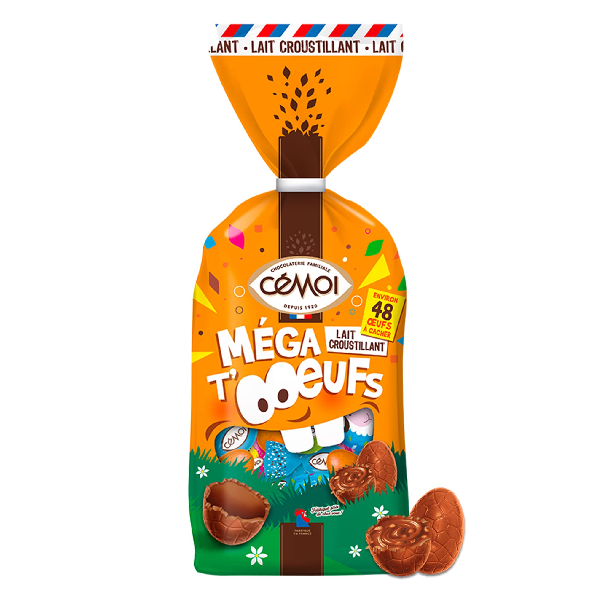 : A more fun Easter egg hunt with Mega Eggs! Colorful eggs and a variety of recipes for fun family moments! Product made in France in our chocolate factory in Troyes. Ingredients: CHOCOLATE CANDIES WITH PRALINE FILLING AND CRUNCHY CEREALS Ingredients: Milk chocolate (sugar, whole MILK powder, cocoa butter, cocoa mass, emulsifiers: lecithins, polyglycerol polyricinoleate, natural vanilla flavoring), sugar, vegetable fats (palm kernel, palm), praline 9 (HAZELNUT paste, sugar), LACTOSE, WHEY powder, crispy cereals 2 (rice flour, WHEAT flour, WHEAT gluten, sugar, WHEAT malt, emulsifier: lecithins, salt), fat-reduced cocoa powder, sunflower and or rapeseed oil, emulsifier: lecithins, natural flavoring. Milk chocolate: 26 cocoa minimum. May contain other NUTS. SUPERIOR MILK CHOCOLATE EGGS (COCOA: 32 MINIMUM) WITH CRISPY CEREALS Ingredients: sugar, cocoa butter, whole MILK powder, cocoa mass, 5 crispy cereals (rice flour, WHEAT flour, WHEAT gluten, sugar, WHEAT malt, emulsifier: lecithins, salt), LACTOSE, skimmed MILK powder, emulsifier: lecithins, natural flavoring. May contain other NUTS. P.when('A').execute(function(A) { A.on('a:expander:toggle_description:toggle:collapse', function(data) { window.scroll(0, data.expander. expander[0].offsetTop-100) }) }) Instructions for use: store in a cool, dry place (18 to 20 C). Disclaimer: Photograph is for illustrative purposes only. The information above is provided for informational purposes only. It is not necessarily exhaustive and should not replace the information on the product packaging, which is the only authoritative source and to which you should refer, particularly in case of food intolerance. See moreA more fun Easter egg hunt with Mega Eggs! Colorful eggs and a variety of recipes, for moments of sharing with the family! Product made in France in our chocolate factory in Troyes.Description du produit Une chasse aux œufs plus fun avec Méga T'oeufs ! Des œufs colorés et des recettes variées, pour des moments de partage en famille! Produit fabriqué en France dans notre chocolaterie de Troyes. Ingrédients BONBONS DE CHOCOLAT FOURRAGE AU PRALINÉ AUX CÉRÉALES CROUSTILLANTES Ingrédients : Chocolat au lait (sucre, poudre de LAIT entier,beurre de cacao, pâte de cacao, émulsifiants : lécithines polyricinoléate de polyglycérol, arôme naturel de vanille), sucre, graisses végétales (palmiste, palme), praliné 9 (pâte de NOISETTES, sucre), LACTOSE, LACTOSERUM en poudre, céréales croustillantes 2 (farine de riz, farine de BLE, gluten de BLE, sucre, malt de BLE, émulsifiant : lécithines, sel), cacao maigre en poudre, huile de tournesol et ou colza, émulsifiant : lécithines, arôme naturel. Chocolat au lait : 26 de cacao minimum. Peut contenir d'autres FRUITS A COQUE. OEUFS EN CHOCOLAT AU LAIT SUPÉRIEUR (CACAO : 32 MINIMUM) AUX CÉRÉALES CROUSTILLANTES Ingrédients : sucre, beurre de cacao, poudre de LAIT entier, pâte de cacao, céréales croustillantes 5 (farine de riz, farine de BLE, gluten de BLE, sucre, malt de BLE, émulsifiant : lécithines, sel), LACTOSE, poudre de LAIT écrémé, émulsifiant : lécithines, arôme naturel. Peut contenir d'autres FRUITS A COQUE. P.when('A').execute(function(A) { A.on('a:expander:toggle_description:toggle:collapse', function(data) { window.scroll(0, data.expander. expander[0].offsetTop-100) }) }) Mode d'emploi A conserver à l'abri de l'humidité et de la chaleur (18 à 20 C) Clause de non-garantie Photographie non contractuelle. Les indications ci-dessus sont données à titre d'information. Elles ne sont pas forcément exhaustives et ne sauraient se substituer aux informations figurant sur l'emballage du produit qui font seules foi, et auxquelles vous êtes invités à vous reporter, notamment en cas d'intolérance alimentaire. Voir plusUne chasse aux œufs plus fun avec Méga T'oeufs ! Des œufs colorés et des recettes variées, pour des moments de partage en famille! Produit fabriqué en France dans notre chocolaterie de Troyes.Cémoi - Sachet Œufs de Pâques Méga T'Œufs Lait Croustillant 424g