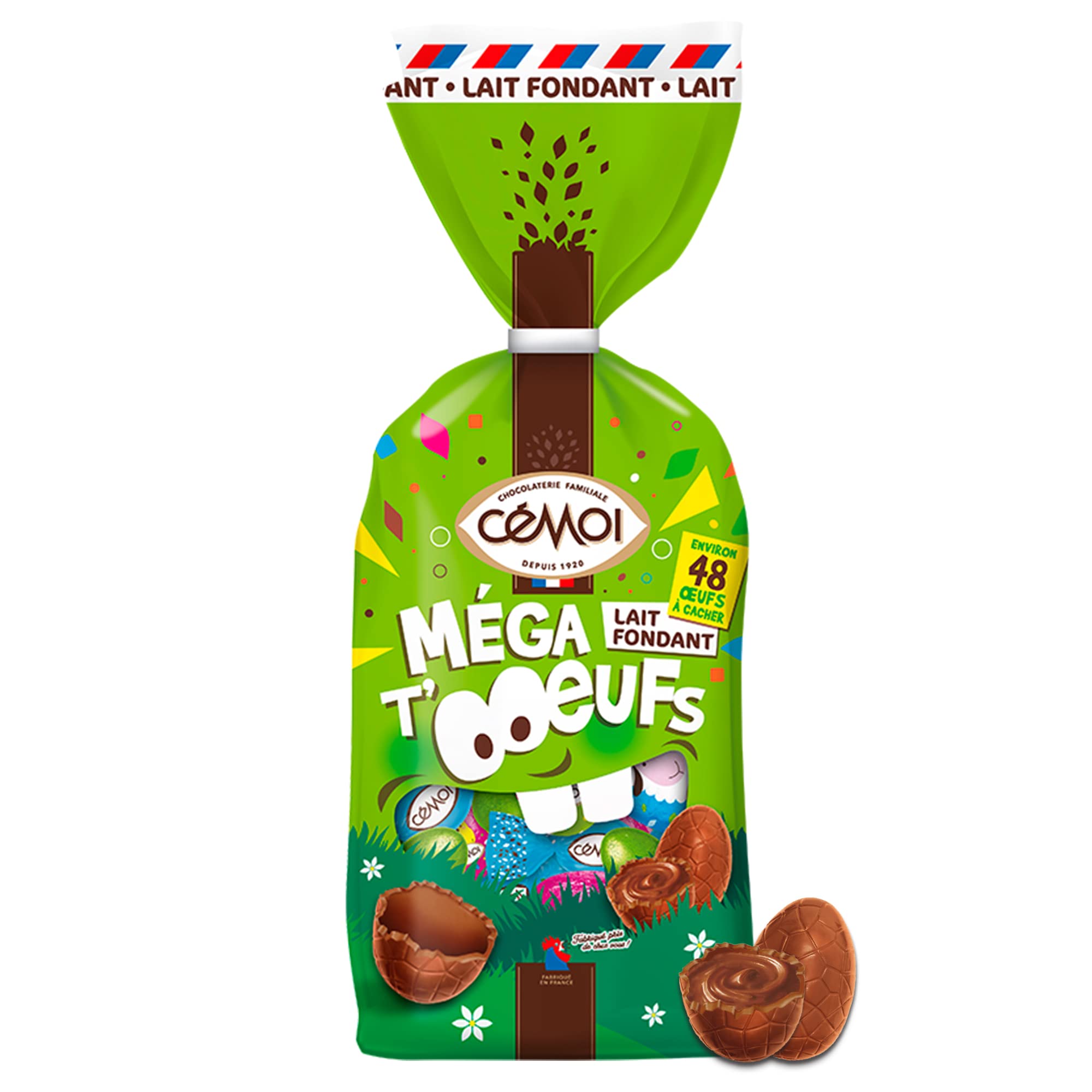 : Make your Easter egg hunt more fun with Mega Eggs! Colorful eggs and a variety of recipes for fun family moments! Made in France at our chocolate factory in Troyes. Ingredients: MILK CHOCOLATE CANDIES WITH PRALINE FILLING Ingredients: Milk chocolate (sugar, whole MILK powder, cocoa butter, cocoa mass, emulsifiers: lecithins - polyglycerol polyricinoleate, natural vanilla flavoring), sugar, vegetable fats (palm kernel, palm), 9 praline (HAZELNUT paste, sugar), LACTOSE, WHEY powder, fat-reduced cocoa powder, sunflower and or rapeseed oil, emulsifier: lecithins, natural flavoring. Milk chocolate: 26 cocoa minimum. May contain CEREALS CONTAINING GLUTEN and other TREE NUTS. MILK CHOCOLATE EGGS (COCOA: 32 MINIMUM) Ingredients: sugar, cocoa butter, whole MILK powder, cocoa mass, LACTOSE, skimmed MILK powder, emulsifier: lecithins, natural flavoring. May contain CEREALS CONTAINING GLUTEN and TREE NUTS. May contain CEREALS CONTAINING GLUTEN and other TREE NUTS. May contain CEREALS CONTAINING GLUTEN.A more fun Easter egg hunt with Mega Eggs! Colorful eggs and a variety of recipes, for moments of sharing with the family! Product made in France in our chocolate factory in Troyes.Description du produit Une chasse aux œufs plus fun avec Méga T'oeufs ! Des œufs colorés et des recettes variées, pour des moments de partage en famille! Produit fabriqué en France dans notre chocolaterie de Troyes. Ingrédients BONBONS DE CHOCOLAT AU LAIT FOURRAGE AU PRALINÉ Ingrédients : Chocolat au lait (sucre, poudre de LAIT entier, beurre de cacao, pâte de cacao, émulsifiants : lécithines - polyricinoléate de polyglycérol, arôme naturel de vanille), sucre, graisses végétales (palmiste, palme), praliné 9 (pâte de NOISETTES, sucre), LACTOSE, LACTOSERUM en poudre, cacao maigre en poudre, huile de tournesol et ou colza, émulsifiant : lécithines, arôme naturel. Chocolat au lait : 26 de cacao minimum. Peut contenir des CEREALES CONTENANT DU GLUTEN et d'autres FRUITS A COQUE. OEUFS EN CHOCOLAT AU LAIT SUPÉRIEUR (CACAO : 32 MINIMUM) Ingrédients : sucre, beurre de cacao, poudre de LAIT entier, pâte de cacao, LACTOSE, poudre de LAIT écrémé, émulsifiant : lécithines, arôme naturel. Peut contenir des CEREALES CONTENANT DU GLUTEN et des FRUITS A COQUE. Peut contenir des CEREALES CONTENANT DU GLUTEN et d'autres FRUITS A COQUE. Peut contenir des CEREALES CONTENANT DU GLUTEN.Une chasse aux œufs plus fun avec Méga T'oeufs ! Des œufs colorés et des recettes variées, pour des moments de partage en famille! Produit fabriqué en France dans notre chocolaterie de Troyes.Cémoi - Sachet Œufs de Pâques Méga T'Œufs Lait Fondant 421g
